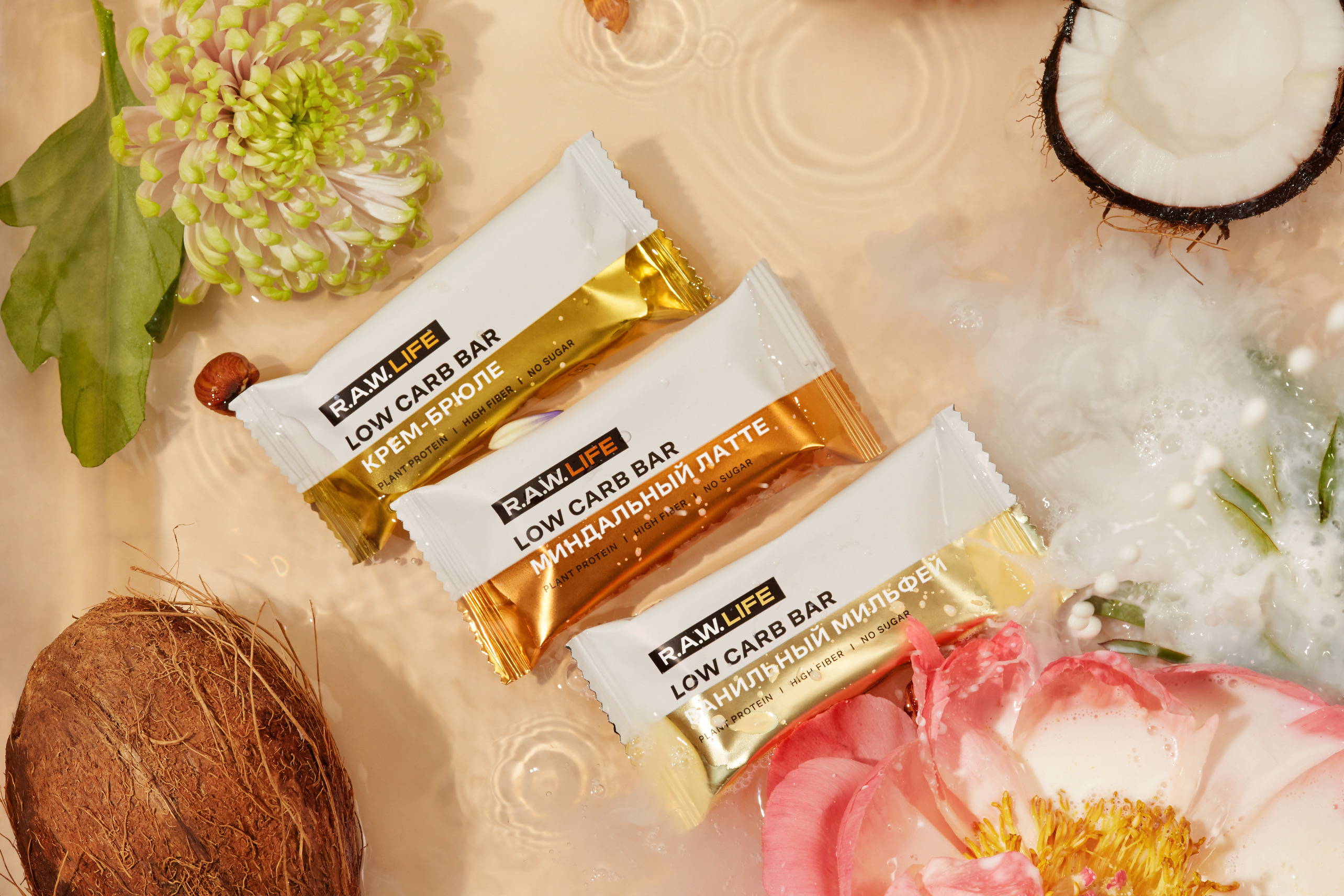Линейка Low Carb включает в себя три вкуса: «Ванильный мильфей», «Крем-брюле» и «Миндальный Латте». В составе — кокосовое молоко, кешью, фундук, миндаль, мескит и отборный кофе.