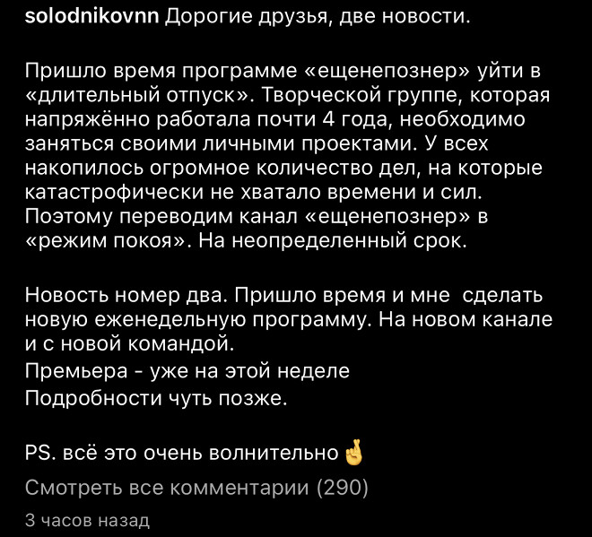 «Пришло время программе "Ещенепознер" уйти в "длительный отпуск". Творческой группе, которая напряженно работала почти 4 года, необходимо заняться своими личными проектами. У всех накопилось огромное количество дел, на которые катастрофически не хватало времени и сил. Поэтому переводим канал "ещенепознер" в "режим покоя"», — написал Солодников.