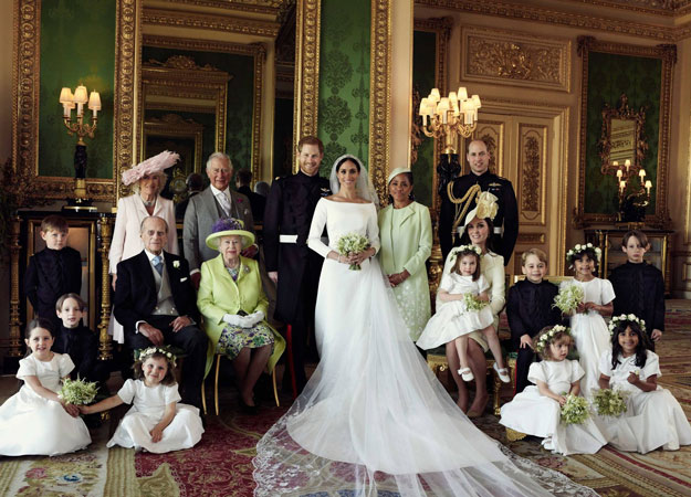 Две цветные фотографии, на которых молодожены позируют в окружении членов королевской семьи и гостей, сняты в Зеленой гостиной Виндзорского замка. Черно-белый портрет герцога и герцогини Сассекских сделан на восточной террасе замка.