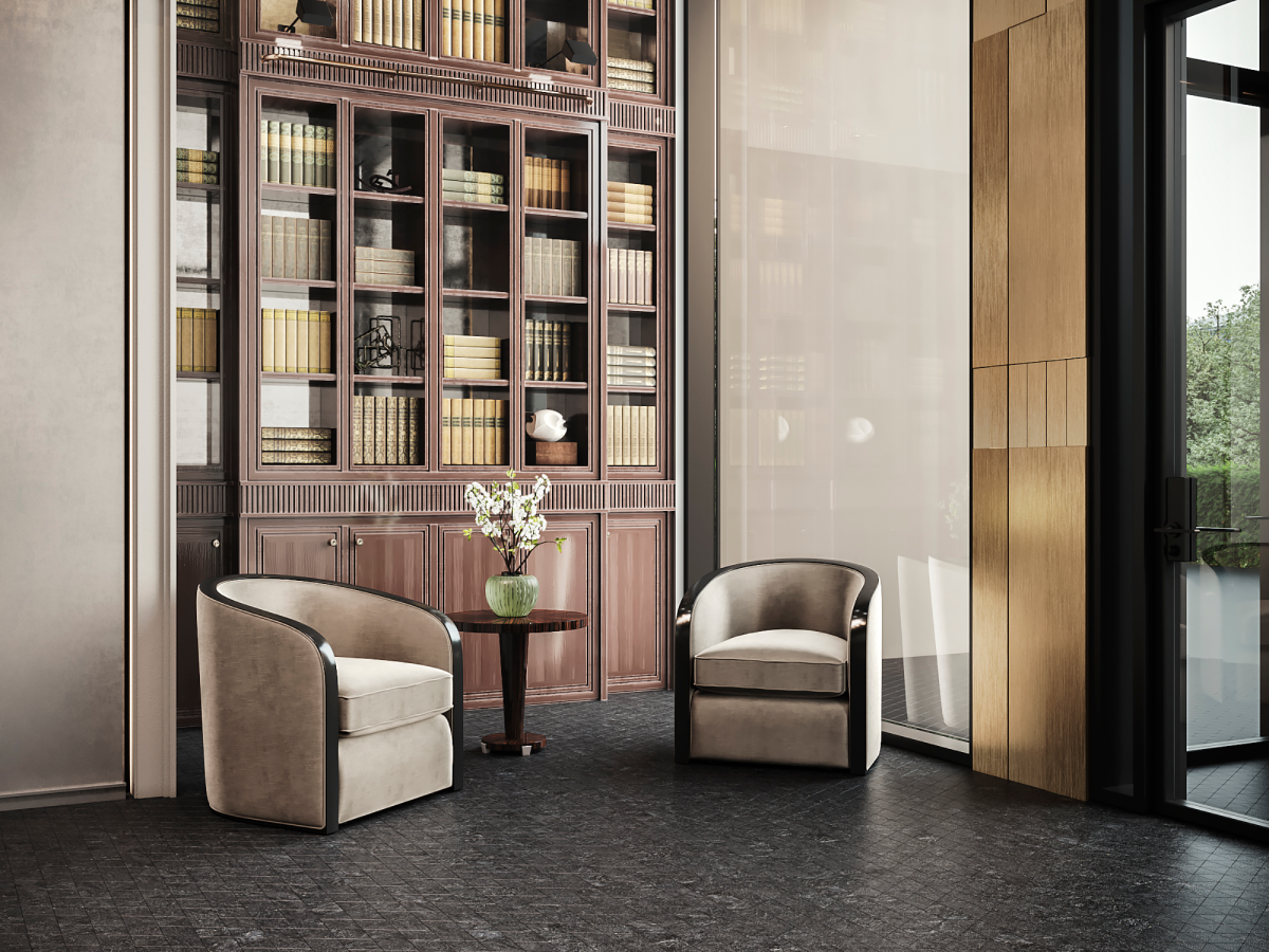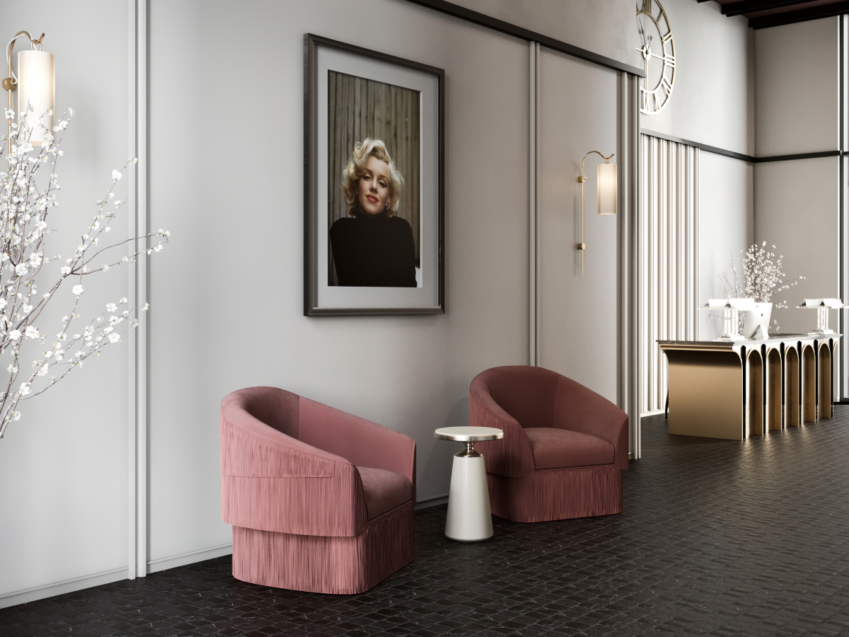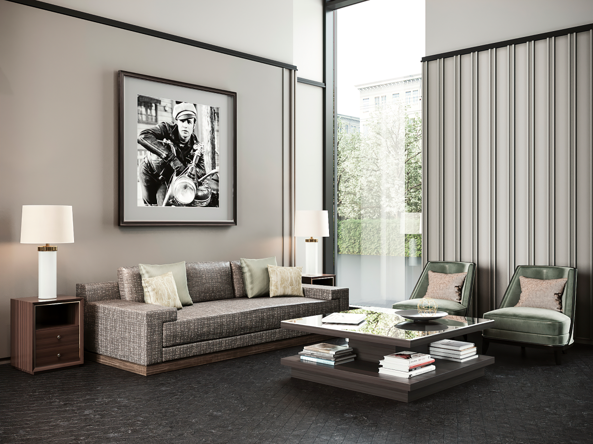 Внушительный масштаб лобби башни «Фрэнк» отличается пластикой стен и сводчатым потолком. А интерьер входной группы корпуса, названного в честь Марлона Брандо, выполнен в мягких темных тонах, дополнен зоной библиотеки. Как киноискусство построено на игре света, так и дизайн построен на тонком чувстве света и тени. Аркады в коридорах стали элементами, формирующими переход из огней большого города в пространство домашнего уюта.