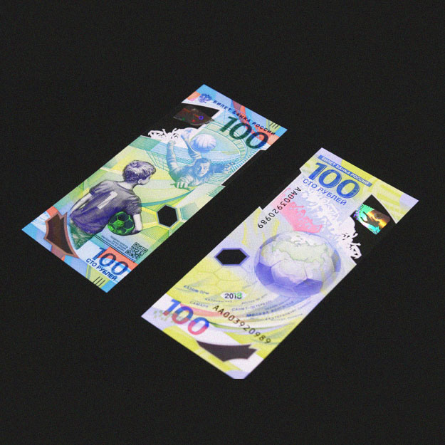 В ультрафиолетовом свете на новых купюрах виден логотип чемпионата мира, а QR-код перенаправит вас на официальный сайт Центробанка, где вы сможете прочесть информацию о защитных признаках банкноты. Всего Центробанк выпустит около 20 миллионов таких «сувениров».