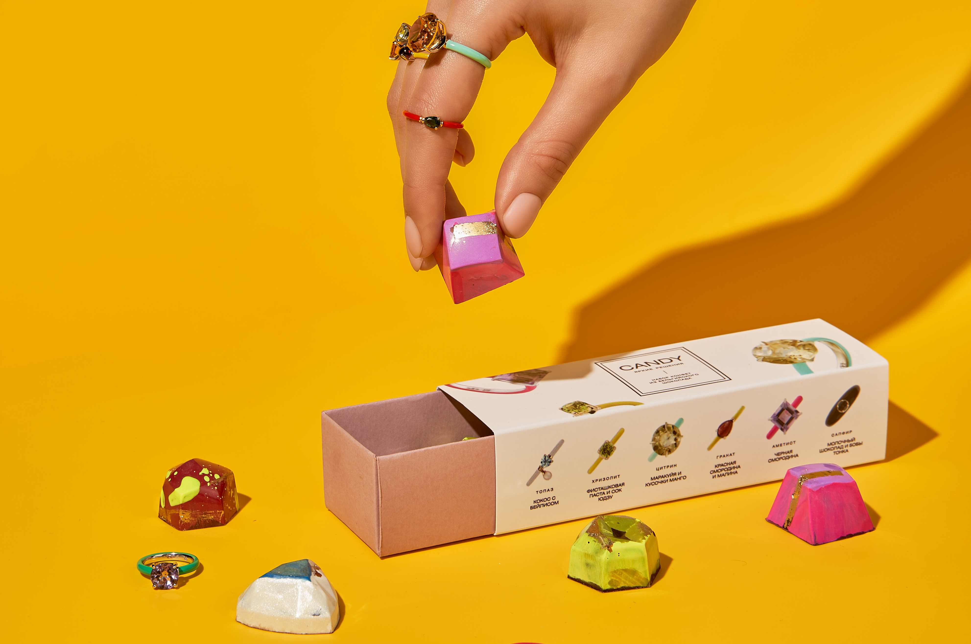 В составе коробки — красный гранат (ганаш из красной смородины с малиновым гелем), зеленый хризолит (ганаш с фисташковой пастой и соком юдзу), синий топаз (ганаш с кокосом и бейлисом), черный сапфир (ганаш из молочного шоколада с бобами тонка), желтый цитрин (белый ганаш с маракуйей и кусочками манго) и фиолетовый аметист (белый ганаш с черной смородиной).