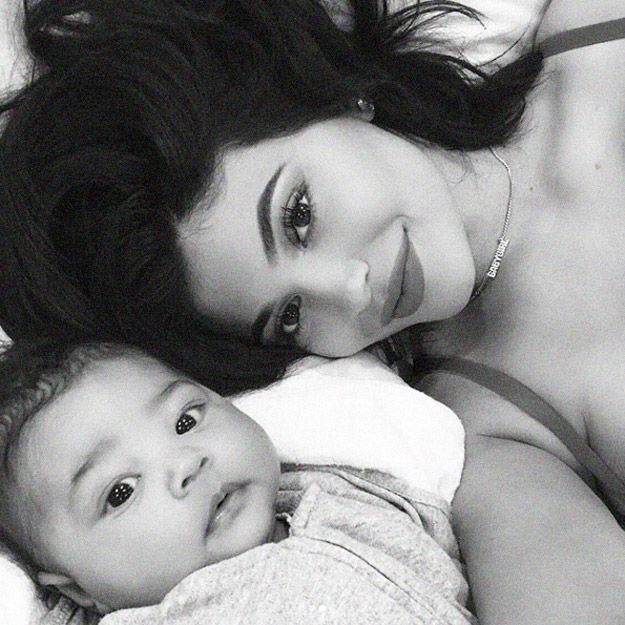 Кайли Дженнер выложила в инстаграме серию из трех черно-белых селфи с дочерью Сторми Уэбстер. На снимках они лежат на кровати, на Кайли — подвеска с надписью «Baby Girl». В начале марта она уже показывала фото с дочерью на руках, когда той исполнился месяц.
