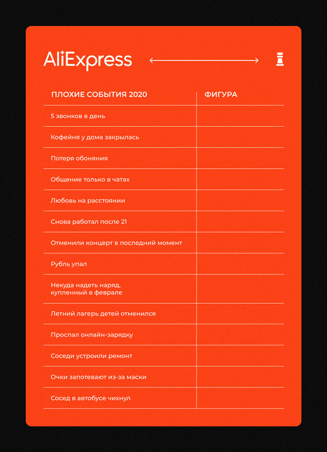 «AliExpress Россия» создала необычные шахматы — в них один из игроков может сыграть за 2020 год. Создатели изменили как доску, так и форму фигур. В новой версии шахмат есть социальная дистанция, которую должны соблюдать фигуры. На клетках есть крестики, которыми обозначена дистанция, и на них нельзя совершить ход.