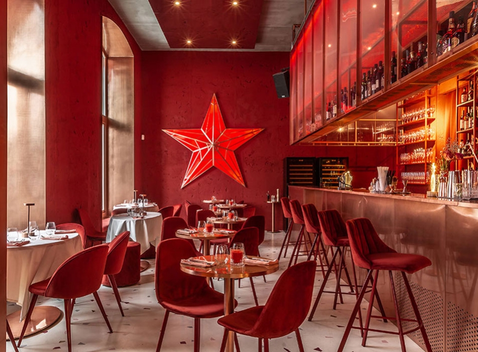 Бар оформлен в интенсивных красных тонах с эффектной пятиконечной звездой. Насыщенная цветовая палитра плавно переходит в пастельные зеленые и розовые оттенки с эффектом градиента. Обе зоны объединяет латунь — материал использован для оформления барной стойки, фасадов открытой кухни, мебели, аксессуаров и светильников.