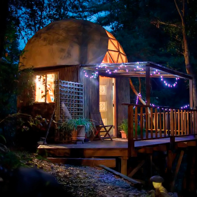 Самой большой популярностью на сайте Airbnb пользуется домик в виде гриба. Он расположен в Центральной Калифорнии, неподалёку от города Санта-Круз. В небольшой кабинке есть спальные места для трёх человек и кухня. Домик окружён лесами и дикой природой — постояльцев предупреждают, чтобы они приготовились к звукам местных птиц и лягушек.