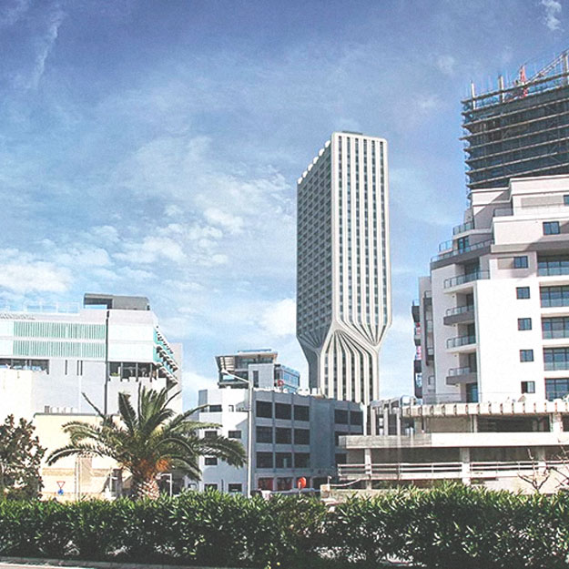 Внутри башни площадью более 9 тысяч квадратных метров будут жилые апартаменты, бутик-отель, а рядом расположатся общественные места, в том числе кафе и магазины. Конструкция состоит из двух частей – девятиэтажного блока с квартирами и 19-этажного отеля, который повернут к Средиземному морю.