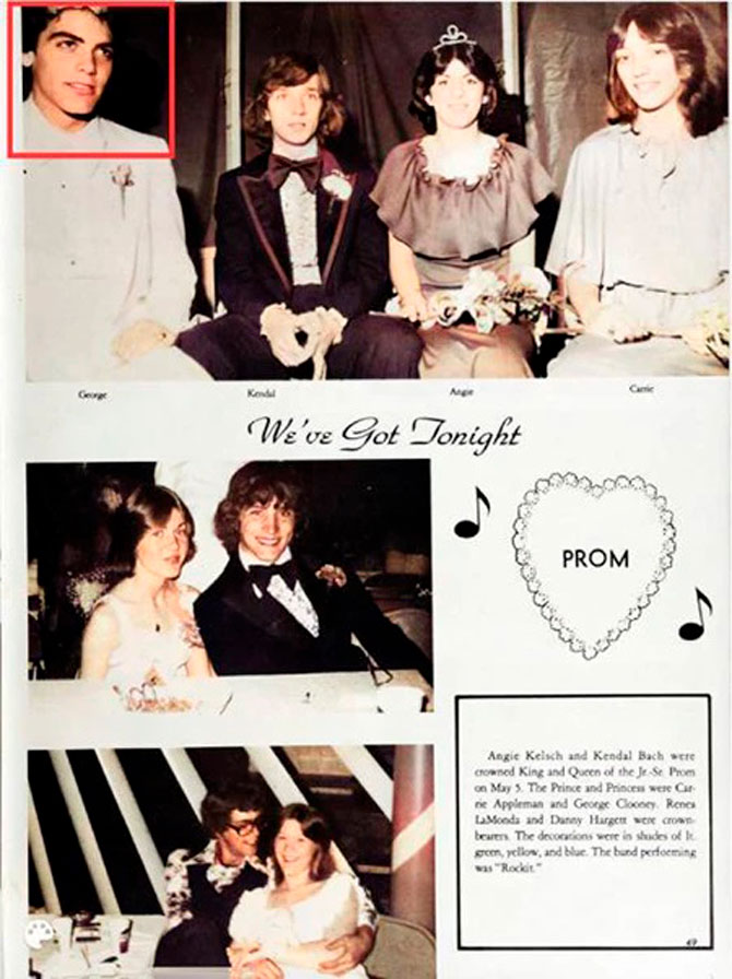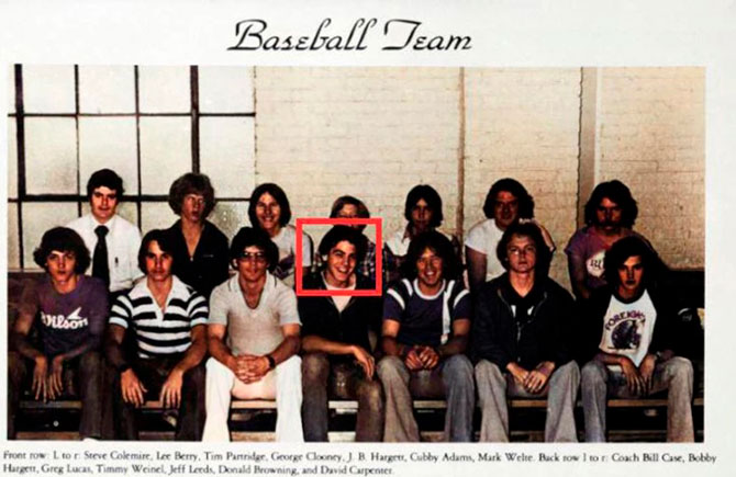 Джордж Клуни окончил старшую школу в городе Аугуста, штат Кентуки. На фотографиях, которые раньше не публиковались в Сети, будущий актер сфотографировался в составе научного клуба, бейсбольной команды — он был заядлым бейсболистом и баскетболистом — и на выпускном балу.