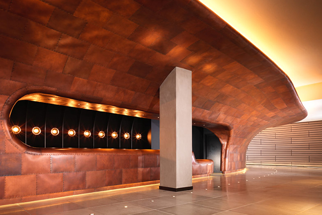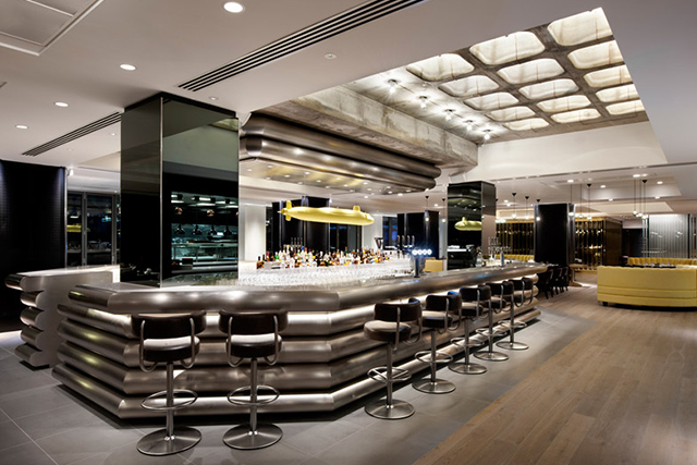 Элегантность трансатлантического лайнера прошлого века прослеживается в каждом уголке нового Mondrian Hotel: постояльцев встречает изогнутая медная стена на стойке рецепции, напоминающая изгиб подводного корпуса судна, гостиничный кинозал выполнен в темно-синем цвете, повсюду встречаются латунные светильники, столики и лестничная балюстрада, в ванных комнатах вместо окон — круглые иллюминаторы, а терраса на крыше, где расположен бар с панорамным видом на Лондон, выполнена в стиле верхней палубы круизного лайнера.