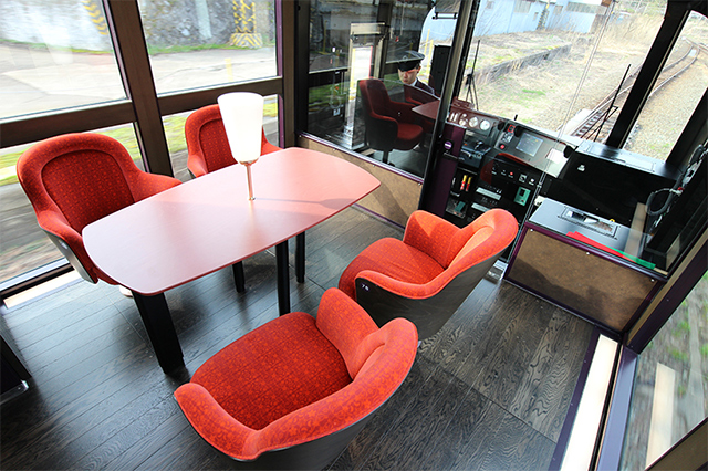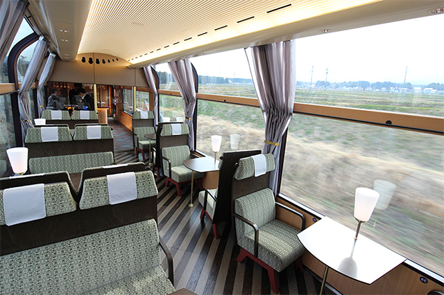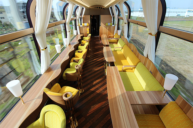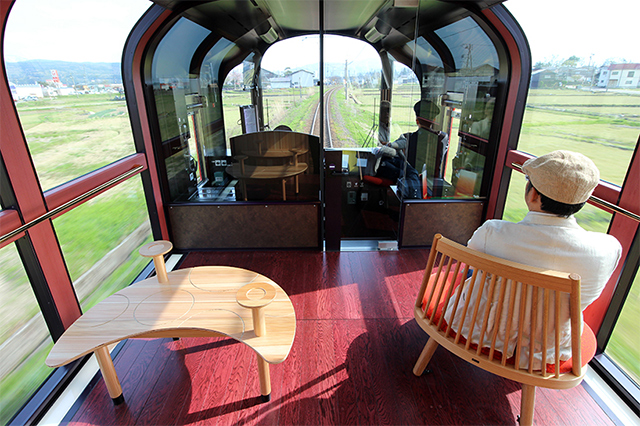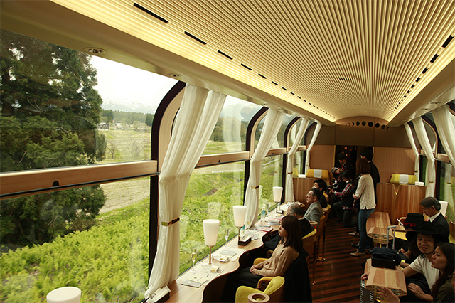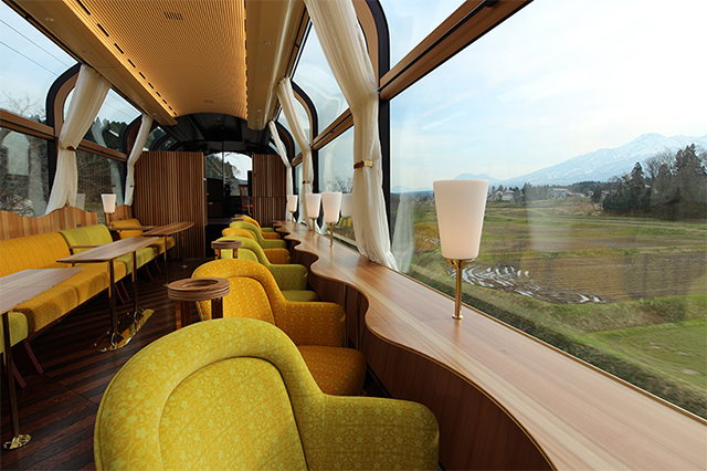 Локомотив начинает свой путь в западной части префектуры Ниигата, так что ловить его нужно именно там. Количество посадочных мест ограничено: всего 2 дивана и 45 кресел. Первый вагон — целиком экскурсионный, второй — французский ресторан. В «стеклянном» поезде можно угоститься традиционным саке и некоторыми японскими блюдами. В концепте вообще был сделан акцент на локальность: материалы для интерьера — местные, цвет экстерьера — красный, чтобы контрастировать со спокойной японской природой, ее водами и горами.