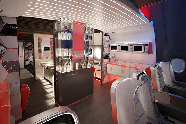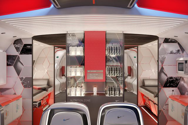 Компания Nike помогает спортсменам не только бесперебойным снабжением кроссовками и одеждой: специально для профессионалов спортивный гигант совместно со студией Teague разработали ультрасовременную концепцию салона в частном джете. В стильном пространстве созданы все условия для комфортного перелета особенно на дальние расстояния. Инновационный лайнер снабжен массажным кабинетом, спальней, гостиной и ванной комнатой, что заняло немало места, и поэтому джет рассчитан только на игроков одной команды из 13 человек.