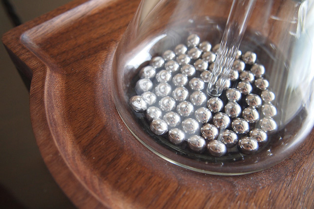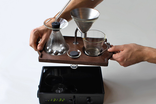 The Barisieur представляет собой устройство "два в одном": часовой механизм в нем объединен с кофеваркой. Перед тем как лечь спать, вам необходимо подготовить молотое кофейное зерно, сахар, воду и установить время сигнала на будильнике. По замыслу дизайнера, ранним утром вас разбудят аромат свежесваренного кофе и неспешное постукивание металлических шариков, нагревающих воду в стеклянной емкости по методу индукции.