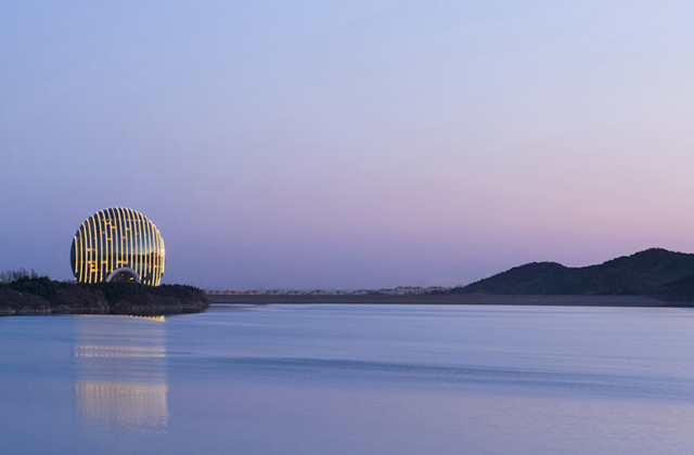 Главный архитектор проекта Чжан Хай Ао из компании Shanghai Huadu Architect Design Co остеклил 10 тысячами панелей весь фасад здания, благодаря чему верхняя часть отражает голубое небо и плывущие облака, средняя — горные хребты Яньшаня, а нижняя — водную гладь прилегающего озера. Не обошлось в дизайне и без фэншуя: вход в форме открытого рта рыбы отсылает к древнему символу процветания. К созданию внутреннего декора, напротив, был привлечен американский офис DiLeonardo. К слову, опасаться за хрупкость гостиницы не стоит: несмотря на короткий срок возведения (24 месяца) и обилие стекла, здание сможет выдержать землетрясение до восьми баллов.