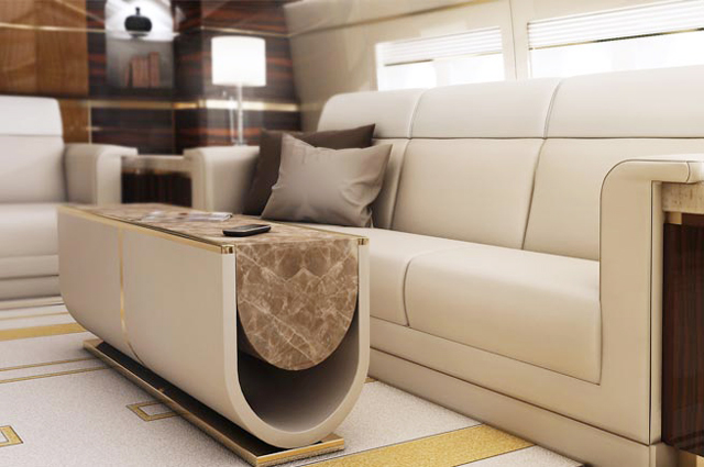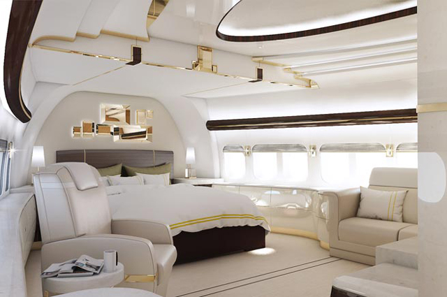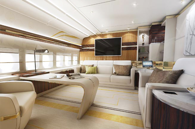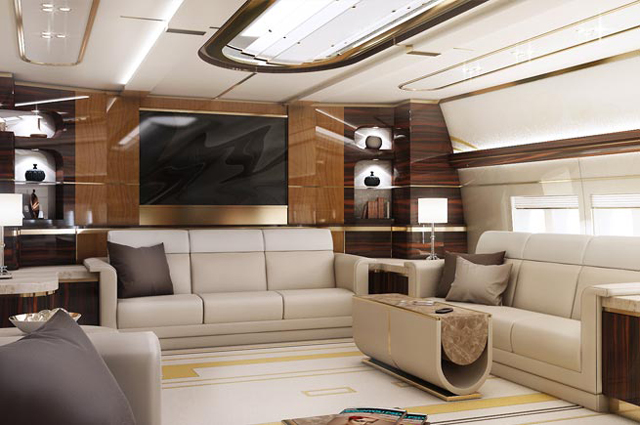 Если вдруг у вас есть лишние 358 миллионов долларов, то новый частный боинг вам придется по вкусу. VIP-интерьер нового самолета можно сравнить с яхтой премиального класса либо люксовым отелем. В салоне авиалайнера представлены огромная гостиная с плазменным телевизором, кожаными диванами, спальня с глянцевым потолком, конференц-зал, просторный холл и даже лифт. Весь интерьер выдержан в бежевых и коричневых тонах.