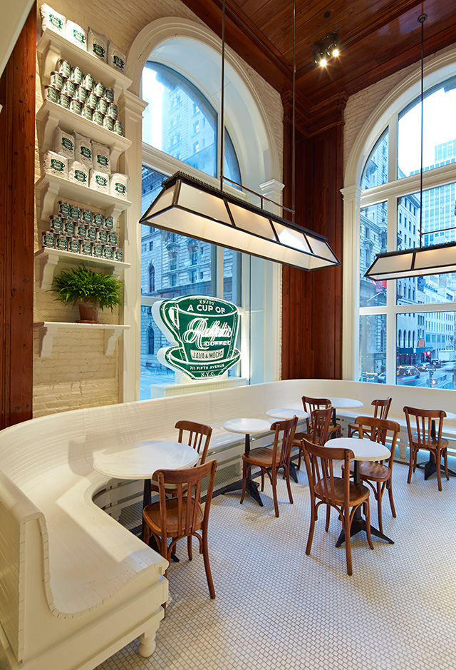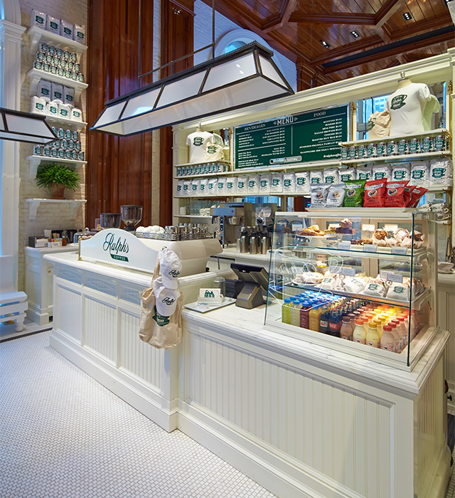 Это не просто просторный магазин площадью более 3500 квадратных метров. На втором этаже центрального бутика разместилась дебютная кофейня дизайнера — Ralph's Coffee. Уютное заведение с почти двухметровыми дубовыми потолками, кафельным полом из белоснежной мозаики и такими же светлыми стенами встречает гостей приветливыми улыбками официантов, разнообразием кофейного меню и круглыми мраморными столиками для уединения около окна с видом на оживленную Пятую Авеню.