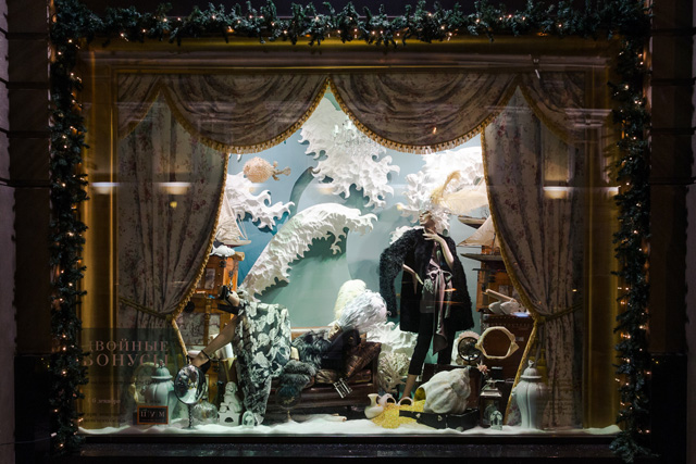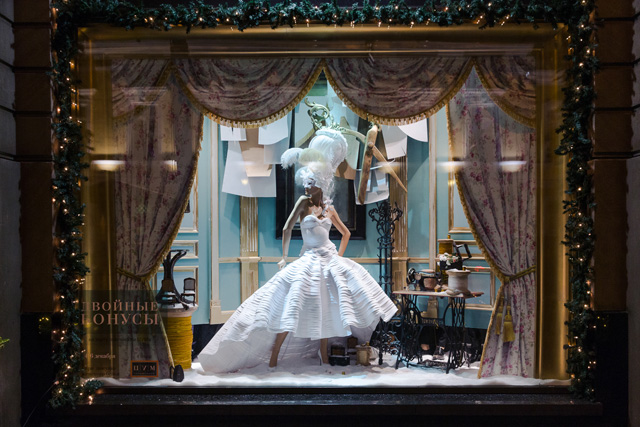 Новогодние витрины ЦУМа в уходящем 2013-м году можно описать лишь двумя словами — роскошь и богатство. Вдохновленная личностями легендарных правительниц — королевы Марии Антуанетты и императрицы Екатерины II, креативная команда универмага не поскупилась на декоративные элементы в оформлении парадных витрин.