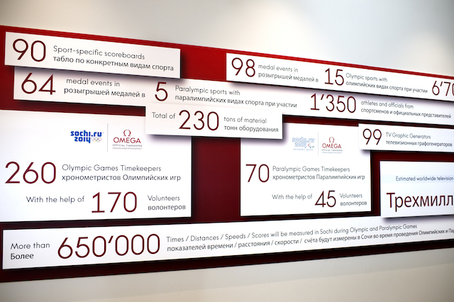 Не менее интересной является выставка самой компании, где собраны хронометры, начиная с 1932 года. Именно тогда Omega стали официальным хронометристом олимпийских игр и на Зимних играх в Сочи в двадцать шестой раз будут отвечать за точность измерений тех самых сотых долей секунд, от которых зависит так много. Стартовый пистолет, камера фотофиниша, самый первый официальный секундомер и другие не менее интересные экземпляры экспозиции этапов развития хронометражей олимпийских зимних игр представлены в павильоне.