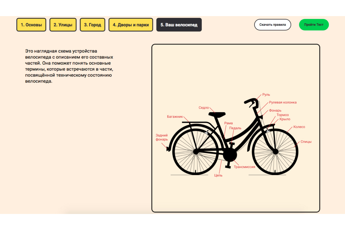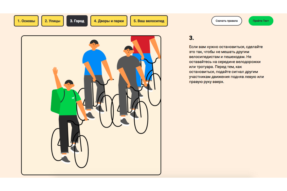 Программа включает в себя подробные правила дорожного движения для велосипедистов, наглядные иллюстрации и тест на знание основ передвижения на велосипеде. Базой для нее стали гайды и чек-листы, которые используются крупными компаниями и велоактивистами из США, Европы и Азии.