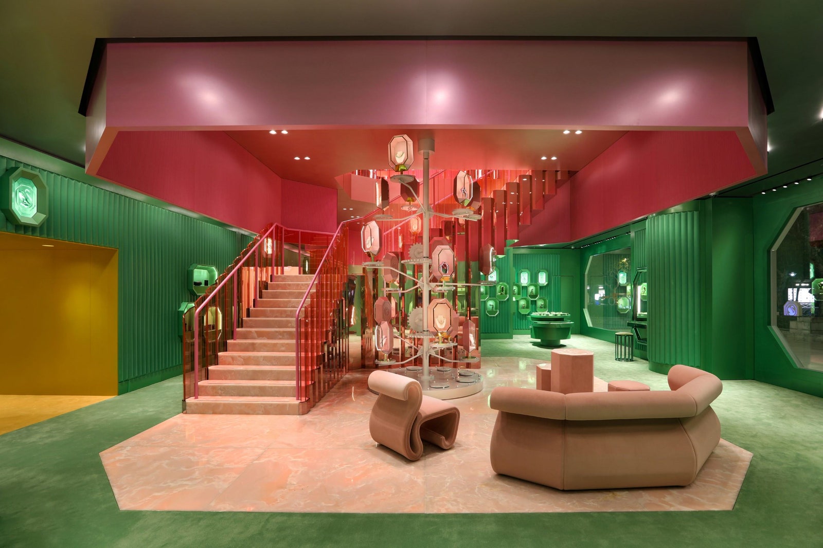 Флагман встречает посетителей «Комнатой чудес», которая выполнена в оттенках розового и зеленого, с вращающимся центральным дисплеем и специально разработанными стульями в форме лебедей. Затем можно подняться по лестнице в футуристичный будуар, где доступна услуга примерки украшения бренда. А главная фишка серебряной «Лаборатории», другого пространства флагмана, — роботизированные руки.