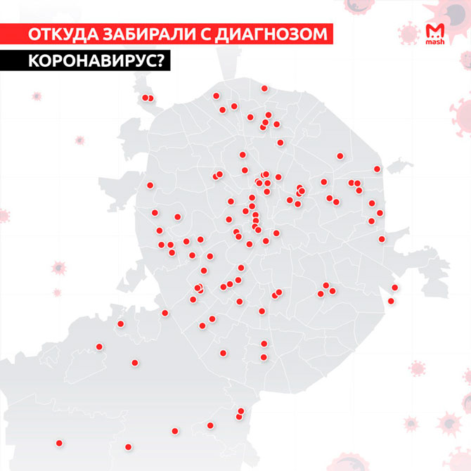 Телеграм-канал Mash опубликовал карту распространения коронавируса по Москве. Авторы инфографики нанесли на карту столицы адреса, по которым медики забирали пациентов с подтвердившимся диагнозом.