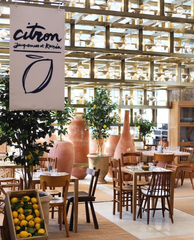 Интерьер Citron by Jacquemus х Caviar Kaspia оформлен в прованском стиле — с простой деревянной мебелью, глиняными вазами разного размера, лимонами в ящиках и лимонными деревьями в горшках. У кафе уже появился собственный инстаграм-аккаунт. В июле Жакмюс и команда Caviar Kaspia планируют открыть в Galeries Lafayette еще одно место — ресторан Oursin.