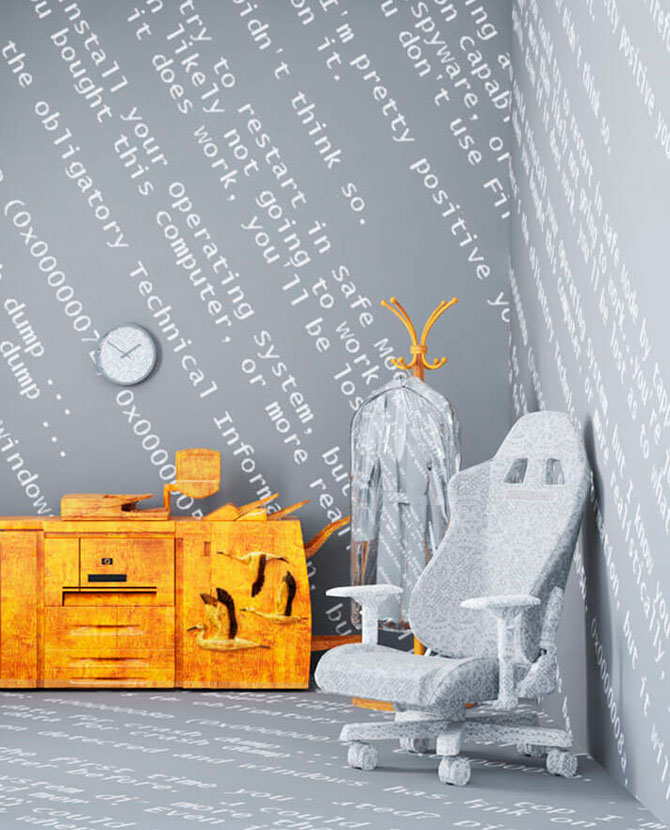 В основе идеи этого проекта — желание Нуриева объединить моду, дизайн и искусство. Каждая деталь инсталляции несет в себе определенный смысл. Так, декорированный деревянными панелями принтер символизирует бюрократию, кондиционер — свежий воздух и смерть, напольная вешалка для одежды — упорядоченность и убивающий индивидуальность дресс-код, а кресло с логотипом Balenciaga — креативность и место, где вы можете скоротать время.