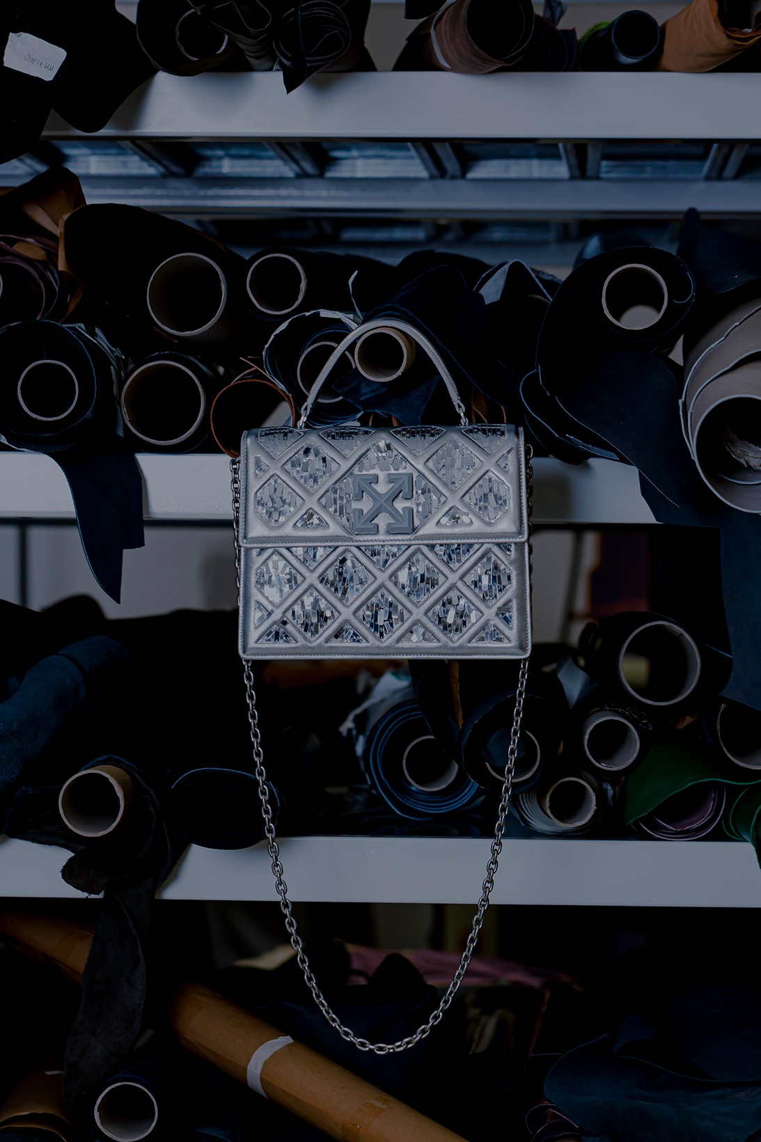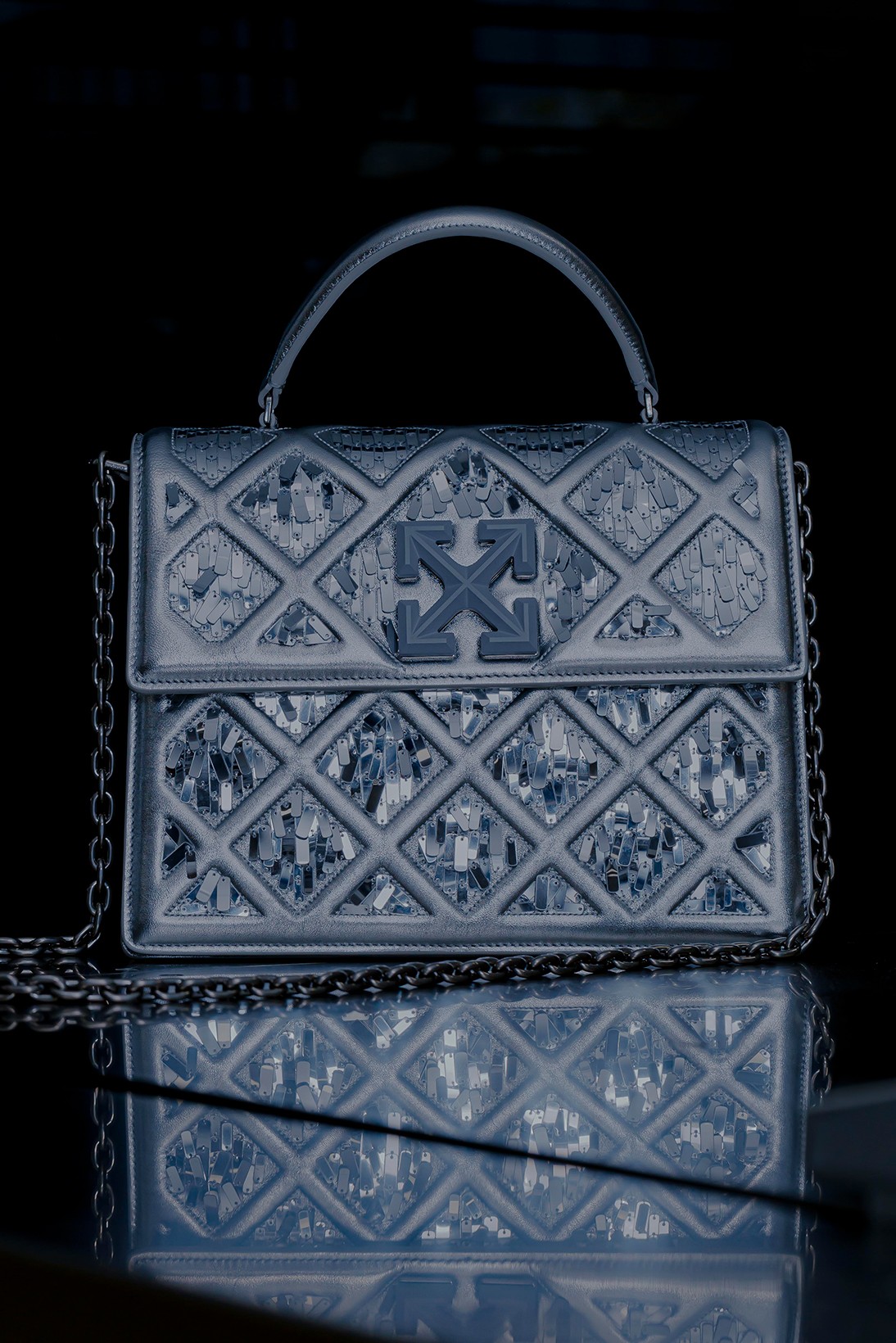 Дизайн сумки вдохновлен стеклянной пирамидой, которая служит главным входом в Лувр. Она была построена во второй половине 1980-х американским архитектором китайского происхождения Бэй Юймином и стала одним из главных символов не только музея, но и всей французской столицы. Аксессуар Off-White изготовлен из телячьей кожи и декорирован прямоугольными пайетками. Hypebae пишет, что тот, кому повезет выиграть торги за этот лот, сможет попасть на один из показов бренда в 2021 году.