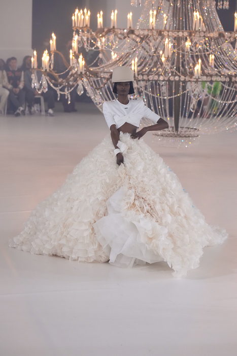 В Париже прошел первый после смерти Вирджила Абло показ Off-White. Бренд представил коллекцию, разработанную еще самим дизайнером. 28 заключительных образов были частью новой кутюрной линии: в нее вошли многослойные юбки из органзы, платья в пайетках со шлейфом, костюмы из черного бархата, комбинезоны полностью в бахроме и накидки с большим бантом. Одежду дополняли объемные кепки, сапоги в пайетках, сандалии из яркого меха и клатчи — один из них был наполнен красными и белыми пилюлями.
