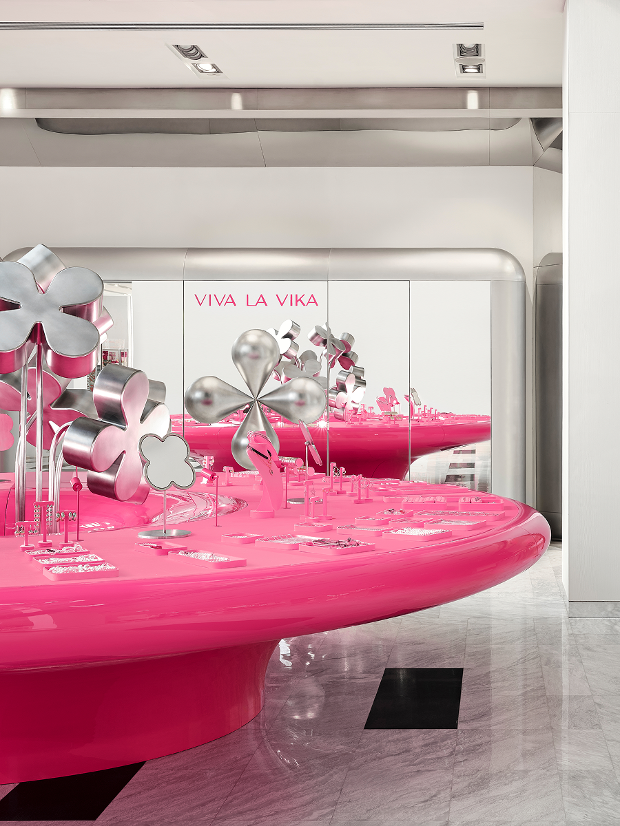 Дизайн построен на узнаваемой ДНК марки — фирменном розовом цвете, металле и зеркалах. В скором времени композиция дополнится еще одной цветочной тумбой со встроенными лайтбоксами, а также стеллажом в форме вазы. За интерьер отвечало архитектурное бюро Kidz.