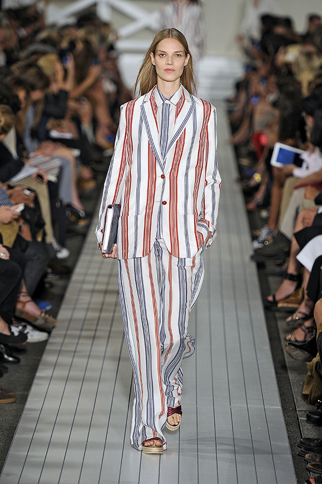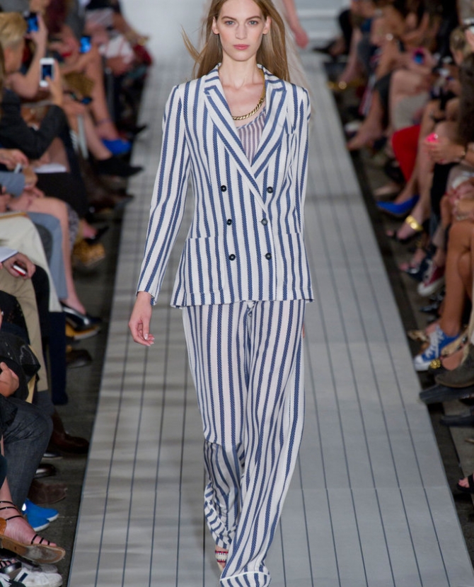 Коллекция Tommy Hilfiger весна-лето 2013 насквозь пронизана морской тематикой: ослепительно белый цвет, легкие, продуваемые ткани и полоски, вертикальные и горизонтальные, всевозможной ширины и расцветок. Марка осталась верна своей традиционной цветовой гамме: темно-синий, ясный красный, черный и белый. Все предметы коллекции легко можно назвать носибельными и функциональными, будь то купальник, без которого летом не обойтись, или растянутая трикотажная кофта на пуговицах, которую можно взять с собой на пляж в особенно ветреный день. Но особенно нам понравились брючные костюмы, сверху донизу покрытые ярким однородным принтом: асимметричным цветным горохом и вертикальной полоской. Костюмы Tommy Hilfiger, которые выглядят так, словно по ним равномерно прошлись волшебной кистью, явно задают тон и дают начало тренду. Особенно учитывая то обстоятельство, что подобный трюк мы видели на показе Lacoste в минувшую субботу.