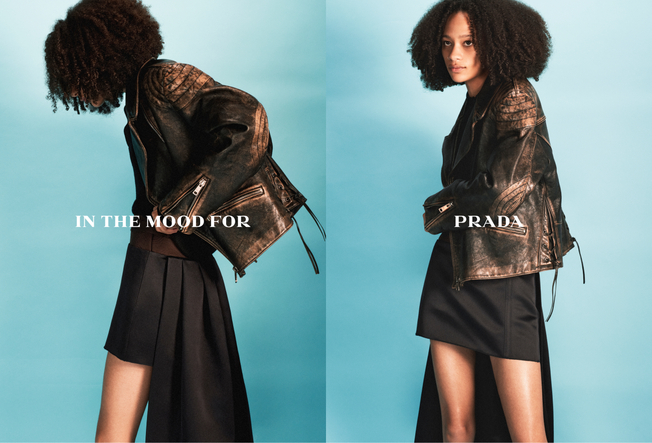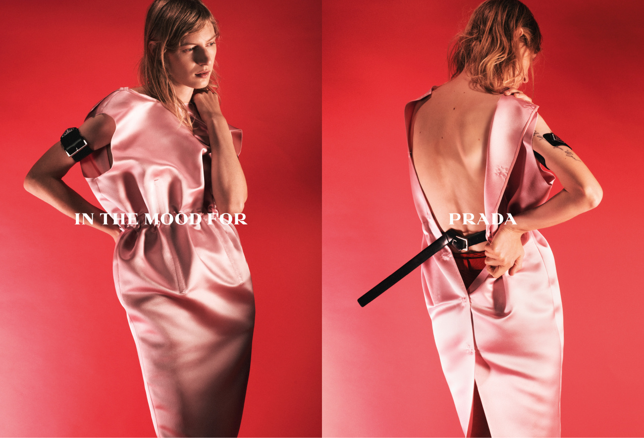 В кампании, озаглавленной In The Mood For Prada, снялась актриса Хантер Шафер, известная по роли Джулс в сериале HBO «Эйфория». К ней присоединились модели Селена Форрест, Джулия Нобис и Лина Чанг. Фотограф Дэвид Симс запечатлил их персональные отношения с одеждой: процесс одевания по утрам и раздевания по вечерам, выбор образа и смену повседневных ритуалов по особым поводам.