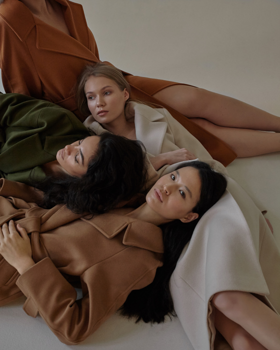 Аида, Женя, Вера и Юлия примерили минималистичные пальто-халаты из облегчённой ткани и двубортные модели сложного кроя бежевого, карамельного и коричневого оттенков и цвета хаки. Кстати, именно с желания создать идеальное пальто и началась история All We Need.