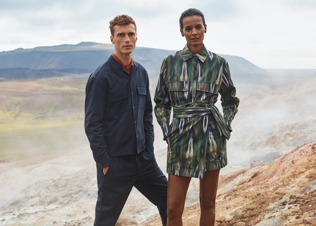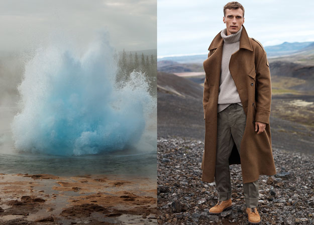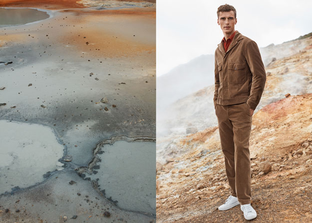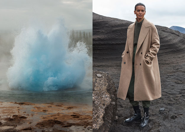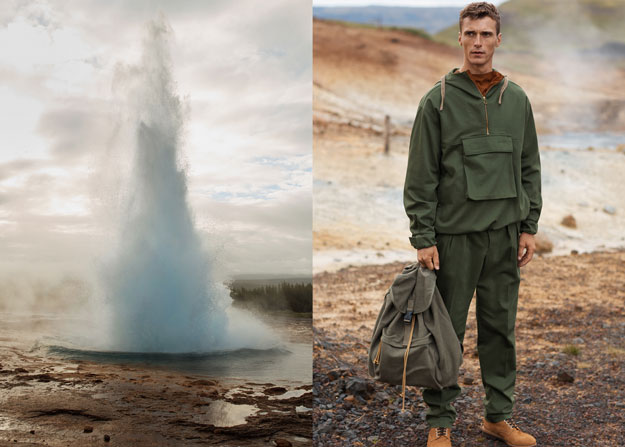 Лукбук коллекции снимали в исландской долине гейзеров. Модели позировали на фоне туманных гор и разноцветных камней.
