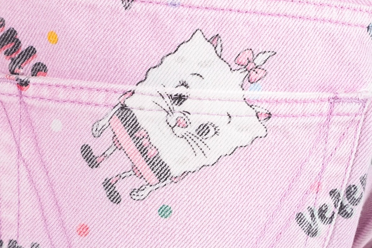 Бренд Vetements выпустил мужские джинсы, вдохновленные детскими пижамами. Новинка выполнена из хлопка розового цвета с изображениями гибридных мультипликационных героев. Например, на них можно заметить Губку Боба, скрещенного с белой кошкой из «Котов-аристократов», или смесь мышонка Джерри и джинна из «Аладдина».