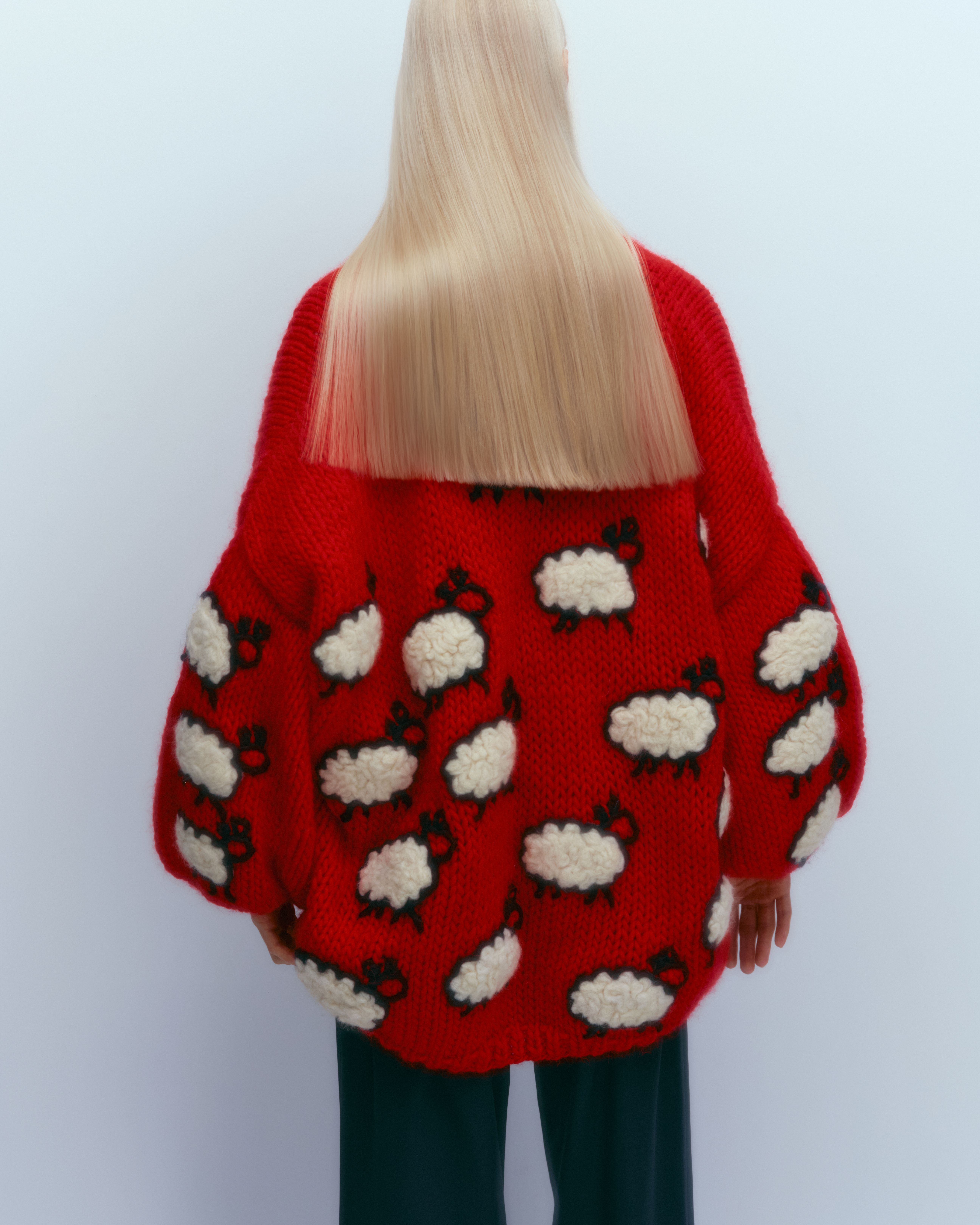 Всего в капсуле семь кардиганов — цвета слоновой кости, песочный, красный и фисташковый с овечками, черный и цвета слоновой кости с яркими цветами, а также цвета слоновой кости с пятнами «под корову».