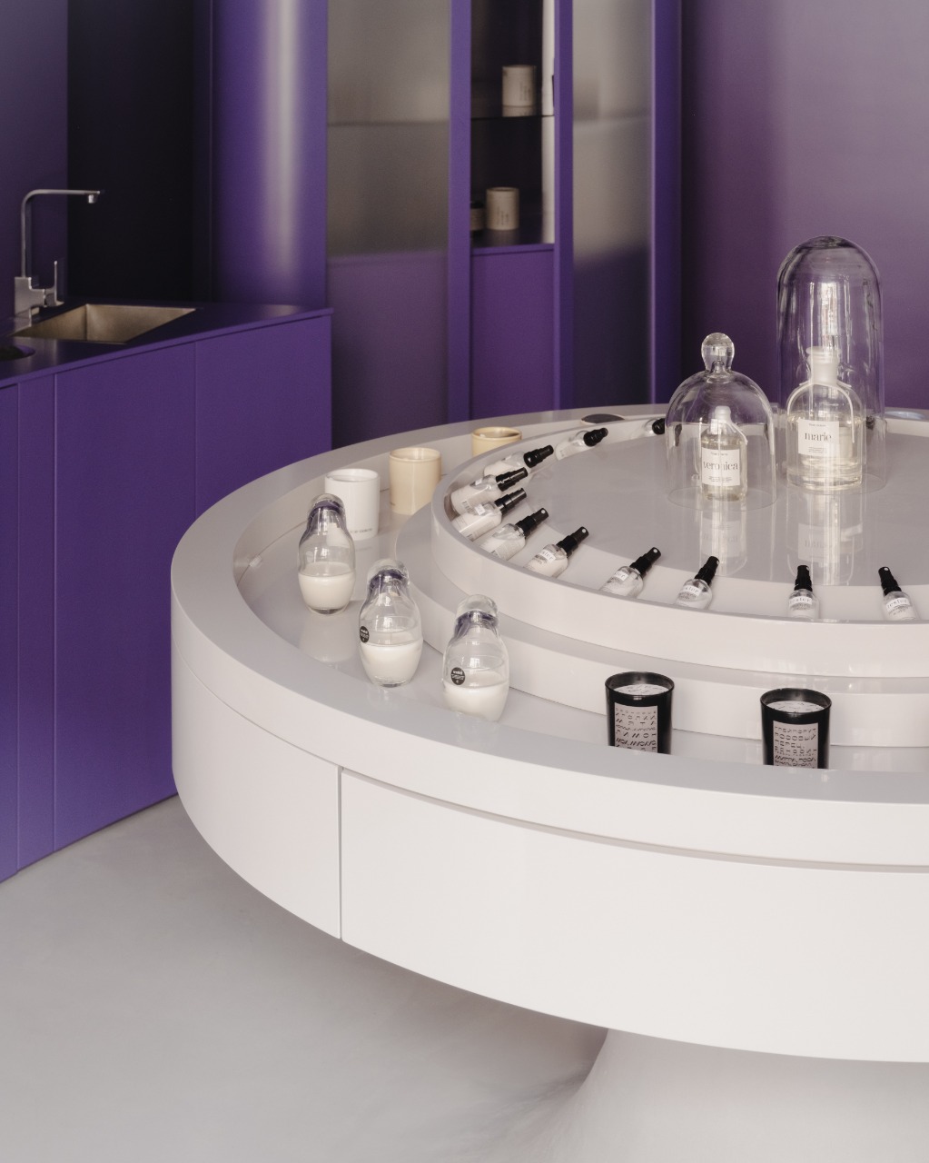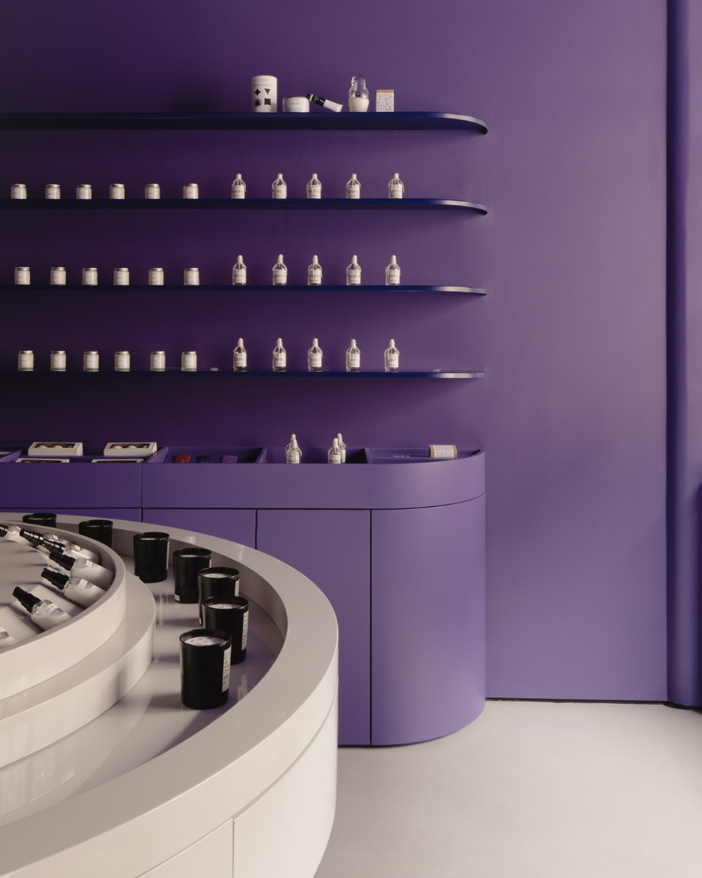 Первый для московской марки магазин в Северной столице стал пространством для размышлений о духе города. Все помещение залито глубоким оттенком фиолетового. Одновременно холодный и теплый, спокойный и энергичный, он напоминает краски петербургского неба на грани дня и ночи, а потолочное освещение становится метафорой звездной россыпи.