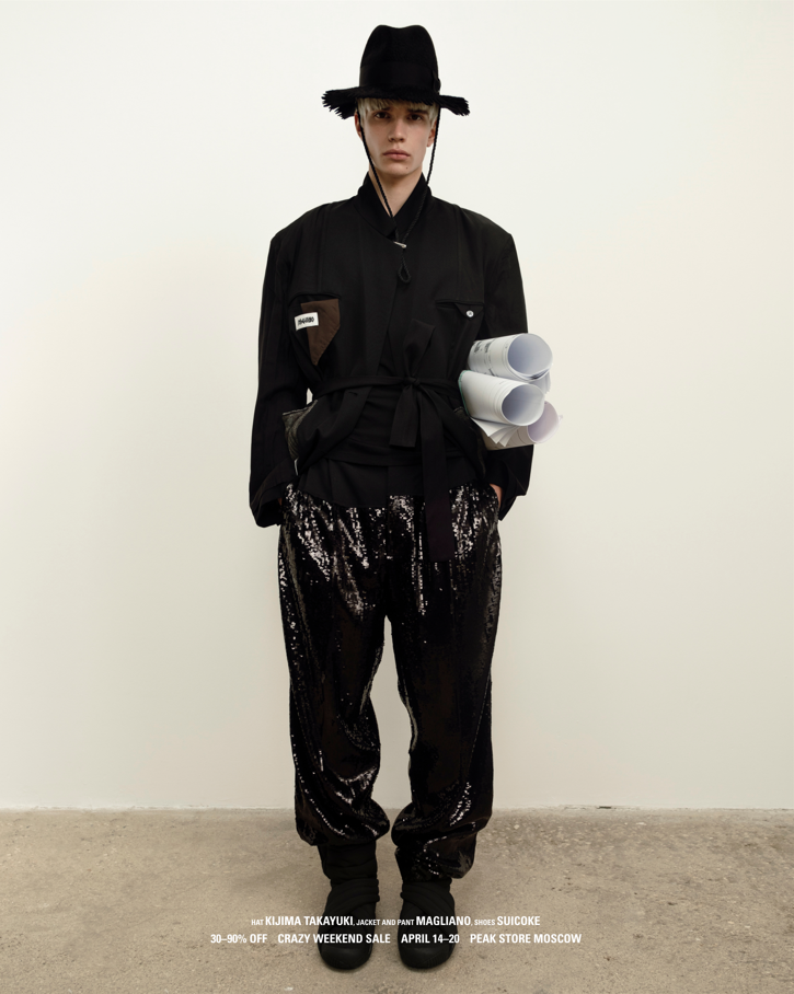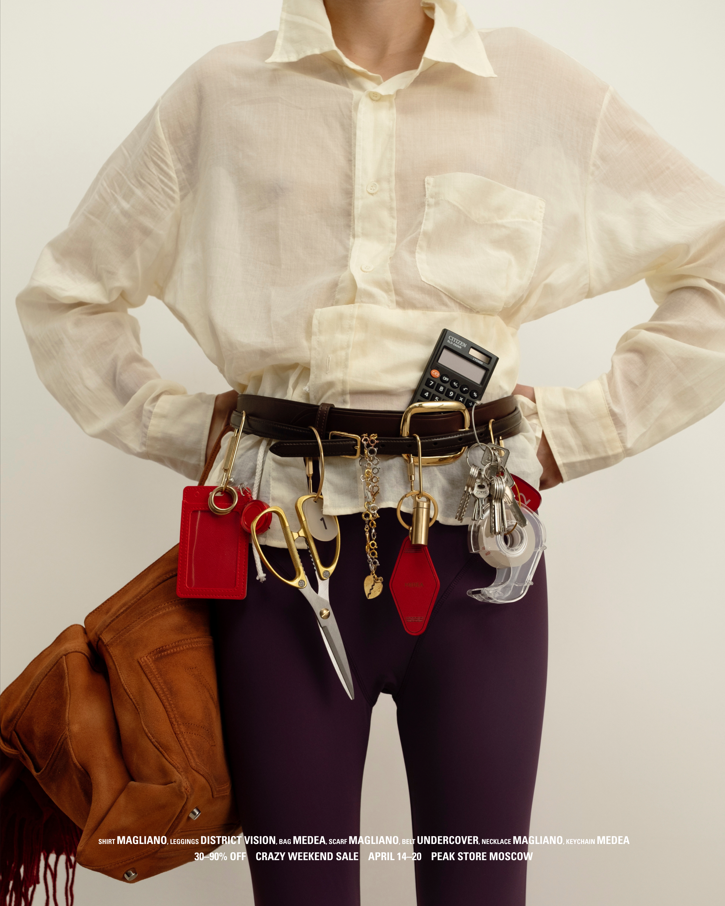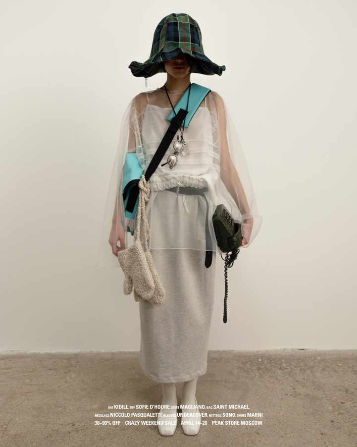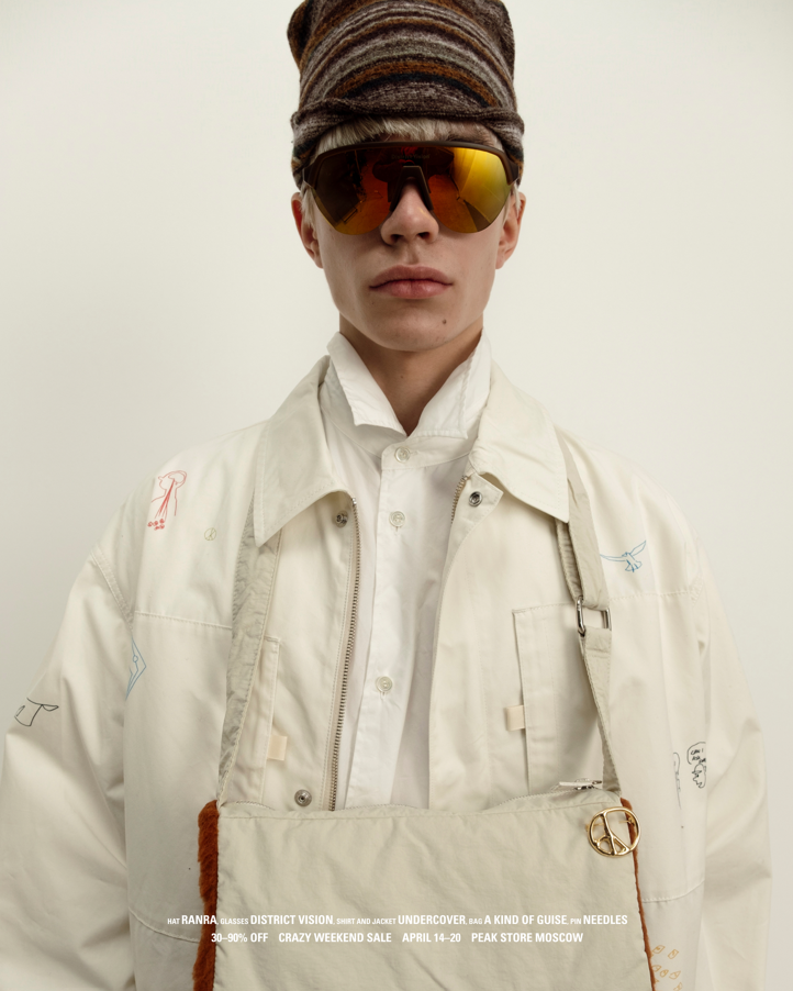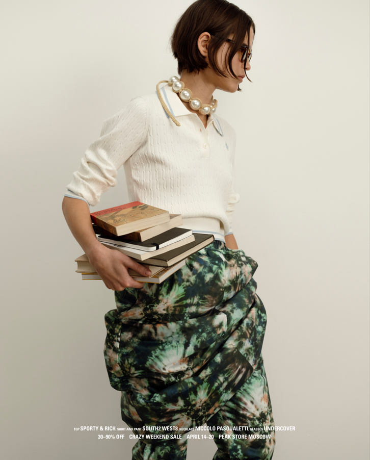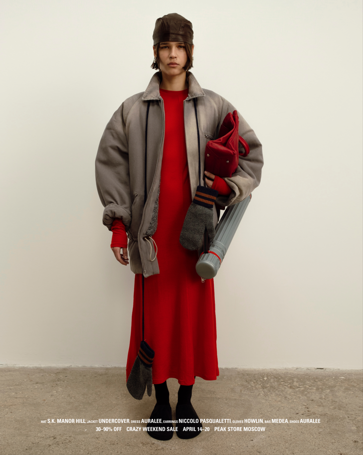 В магазине Peak с 14 по 20 апреля проходит традиционный Crazy Weekend Sale. На двух этажах концепт-стора на Петровском бульваре можно найти коллекции более 100 брендов, включая хедлайнеров международных недель моды — Undercover, Magliano, Auralee и Ssstein, — со скидками до 90%. Лукбук к распродаже стилизовала Юлия Бегунова, а фотографом выступил Павел Харатян.