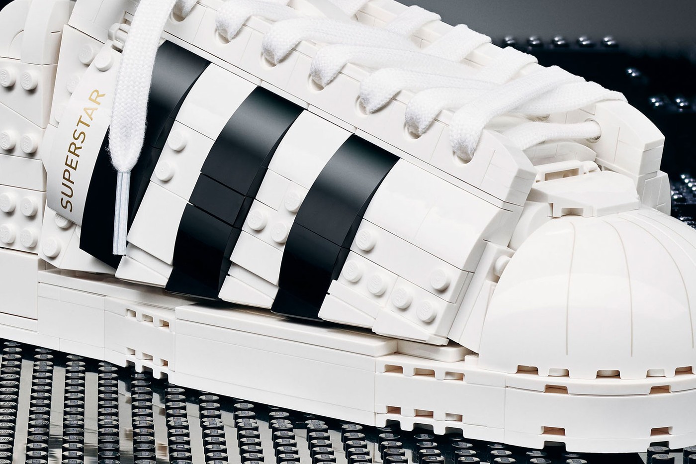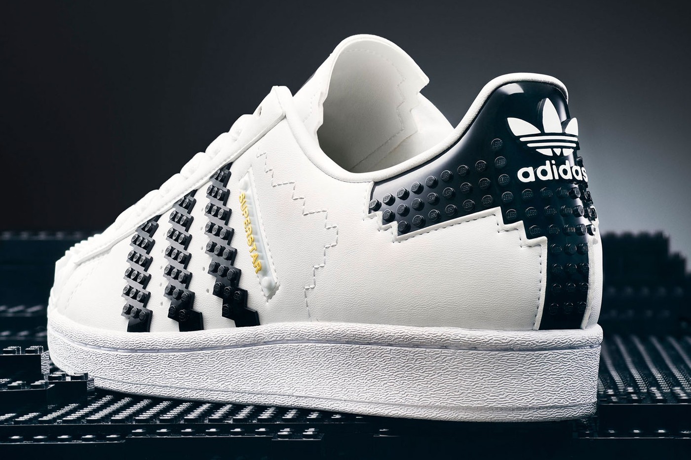 Носок, задник и боковые полоски настоящих кроссовок Superstar из коллаборации декорированы рельефными элементами, которые отсылают к стандартным деталям Lego. В продаже они появятся в июле.
