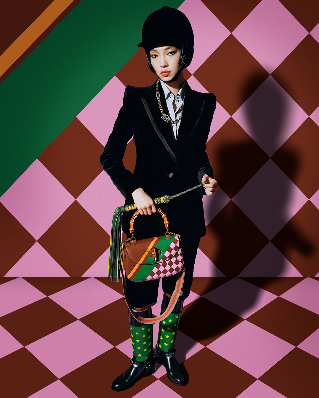 Над второй частью кампании работал фотограф Лесли Чжан. Здесь представлены вещи, посвященные тематике конного спорта, — жокейский шлем, обувь с широким голенищем и наколенники, превратившиеся в наплечники. В этой части коллекции содержатся отсылки к предыдущим руководителям дома.