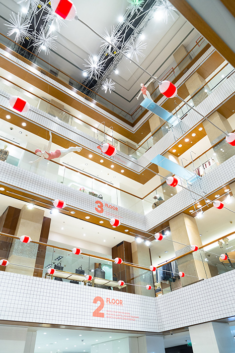 К летнему сезону ЦУМ представил новое оформление универмага. Первый этаж превратился в огромный бассейн с дорожками, трамплинами и ныряльщиками, второй — в площадку для гольфа, интерьер третьего этажа посвящен теннису, а четвертого — серфингу.