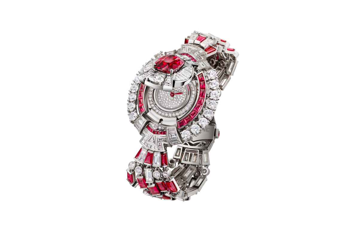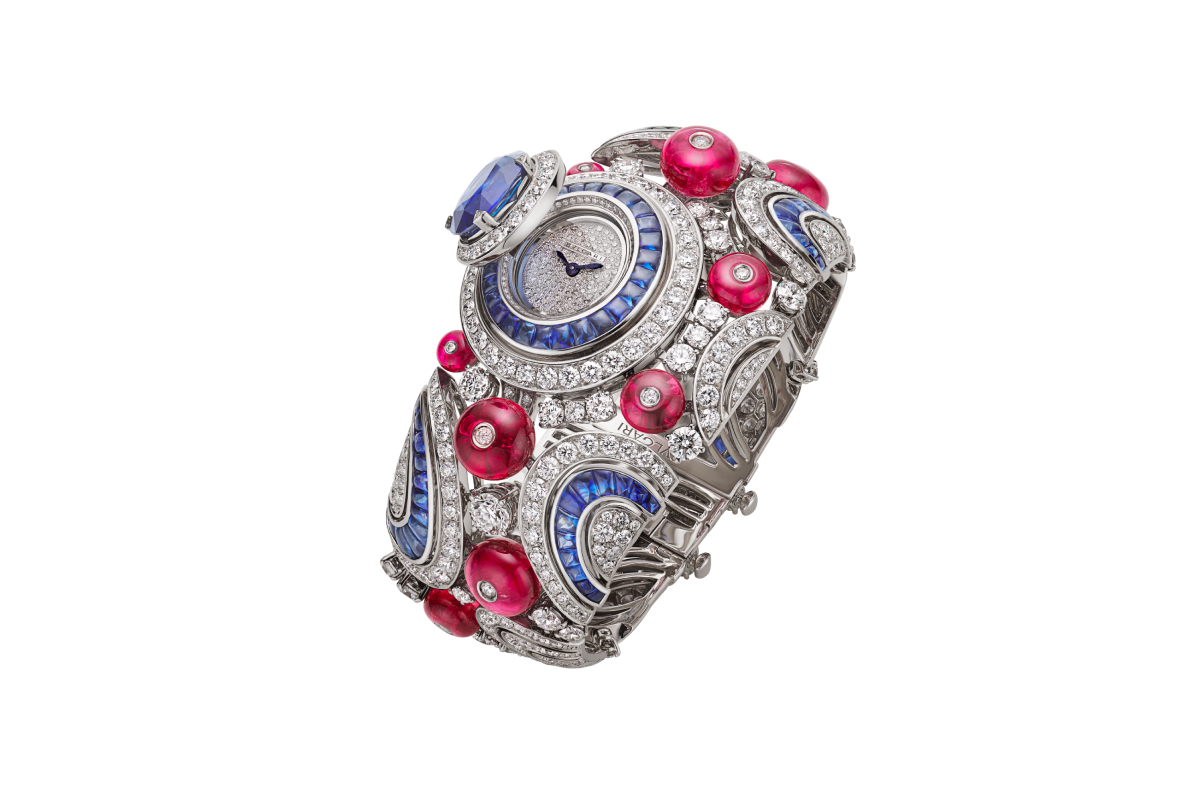 Модель Baroque Spiral из розового золота усыпана рубинами, сапфирами и изумрудами огранки «кабошон», которые дополняет бриллиантовое паве. Спиральный мотив отсылает к барочной эстетике. Главным элементом платиновых часов Celestial Sky стал овальный сапфир из Шри-Ланки. Его оттеняют более мелкие сапфиры фантазийной огранки, круглые бриллианты и турмалины-кабошоны.