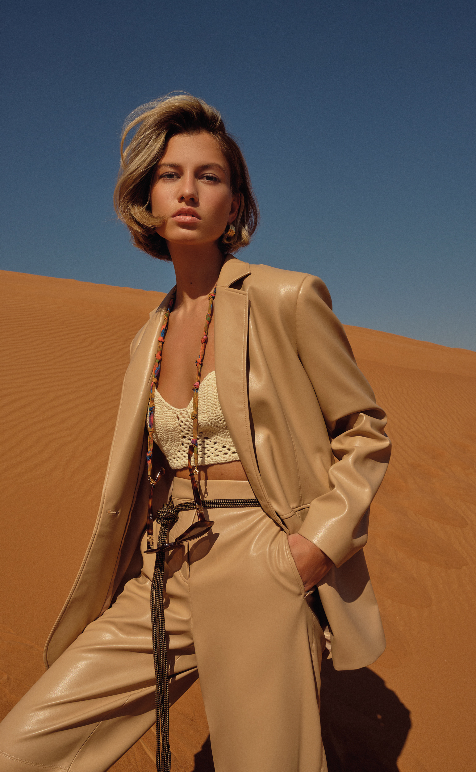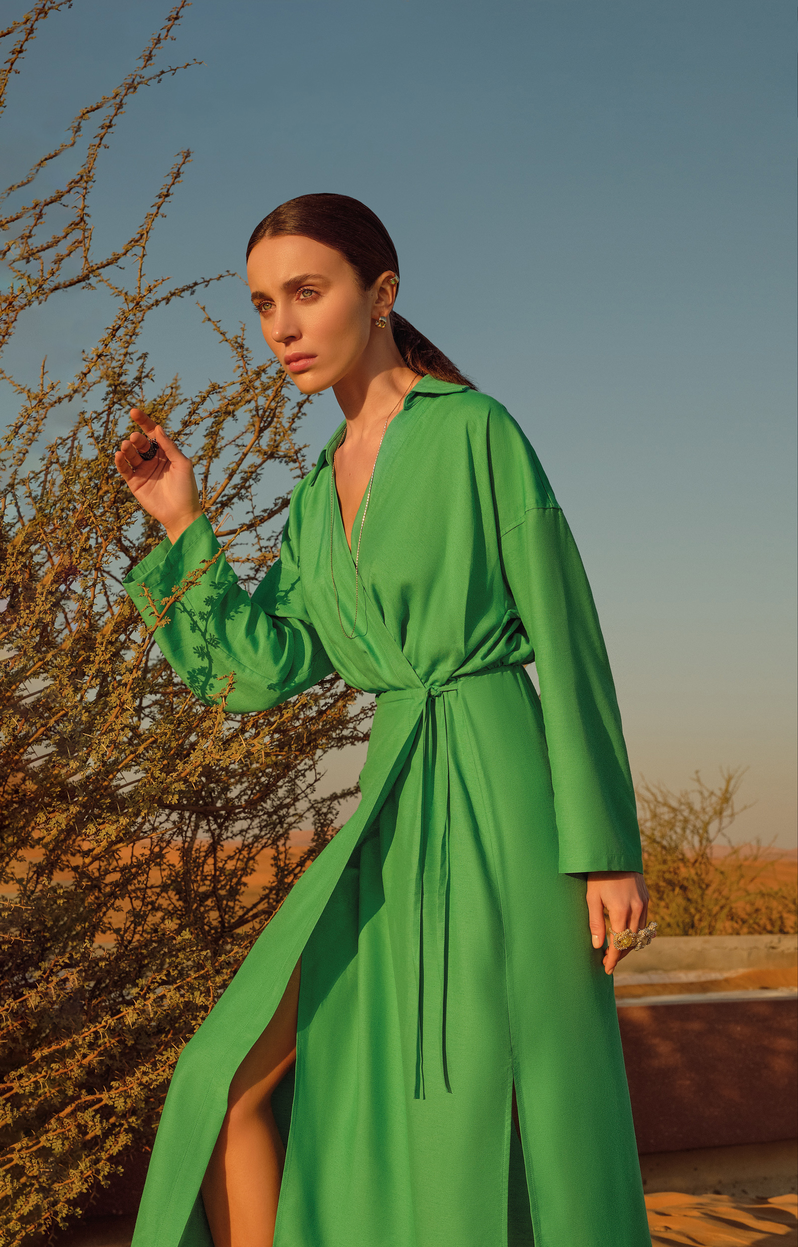 В новую коллекцию вошли брючные костюмы, платья, пиджаки, тренчи из экокожи, рубашки и футболки необычного кроя и фактуры. Цветовую палитру линейки составили яркие оттенки розового и зеленого, а также приглушенные серые и бежевые цвета.