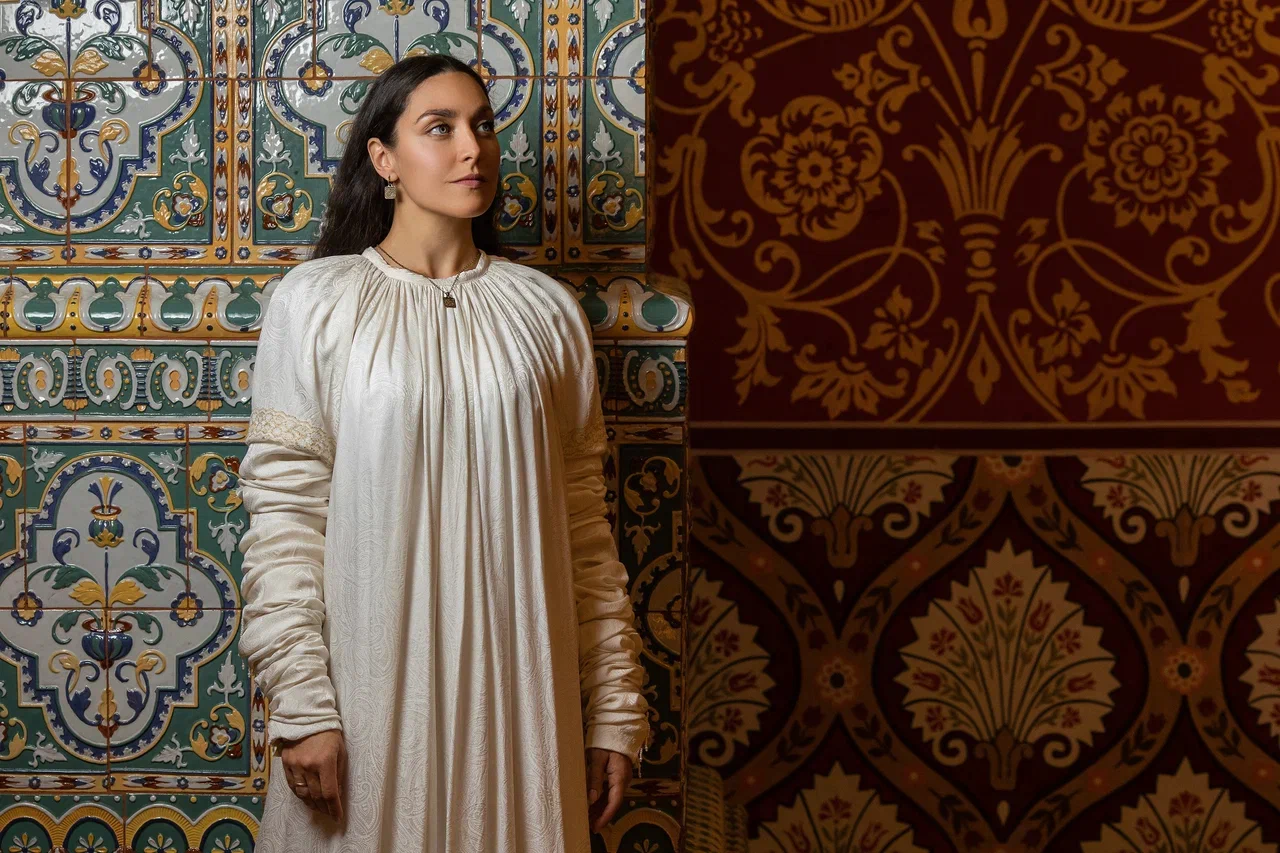 Особым украшением интерьеров Дворца царя Алексея Михайловича, где проходила съемка новых коллекций, являются прямоугольные и круглые печи, декорированные зелеными и многоцветными поливными изразцами. Они были реконструированы на основе подлинных изразцов, найденных во время археологических раскопок на территории музея-заповедника «Коломенское».