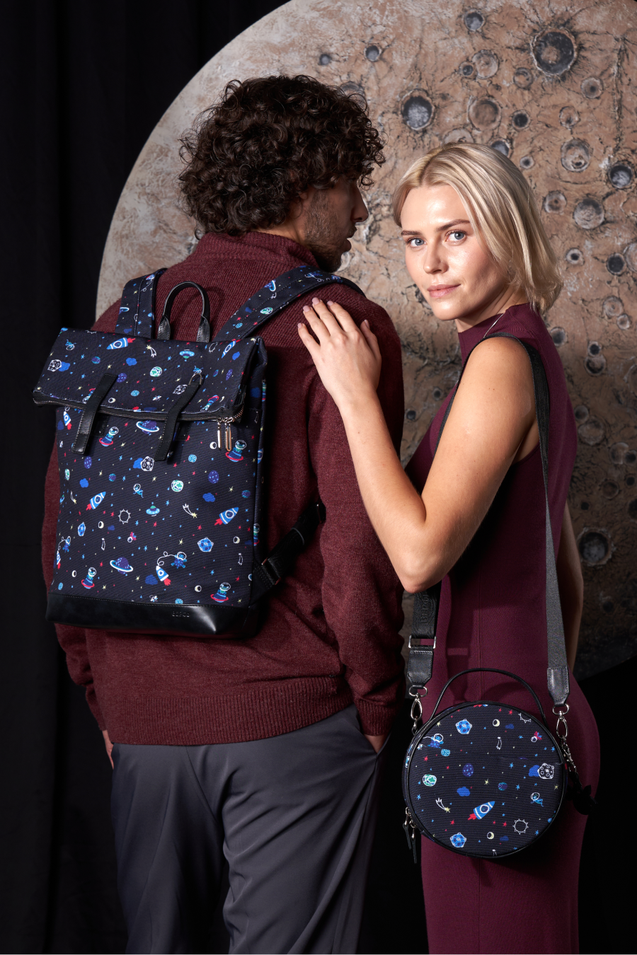 В капсулу вошли кожаные изделия с тиснением в виде главного персонажа мультфильма, а также аксессуары с яркими принтами космоса. В линейке есть рюкзаки с отворотом и геометричные сумки на молнии в двух размерах: поменьше — для детей, побольше — для взрослых.