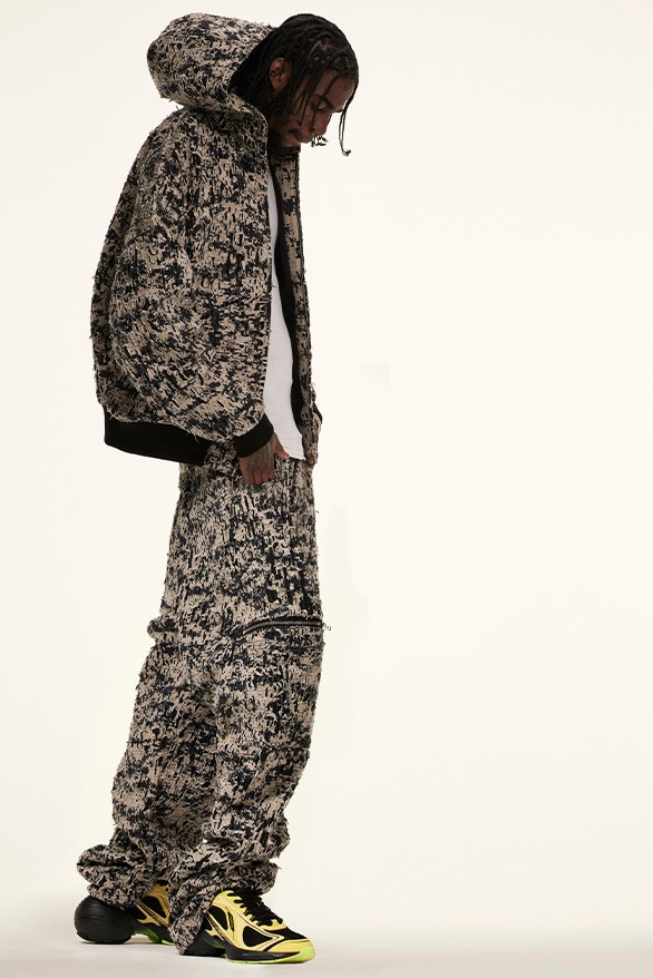 Alkaline примерил спортивные костюмы с камуфляжным принтом, байкерскую куртку в бело-черной палитре с логотипом бренда, брюки карго, пиджак, прямое пальто. Классическую одежду музыкант сочетает с банданами, шапками, кепкой и футуристическими очками.