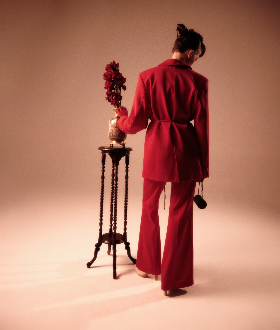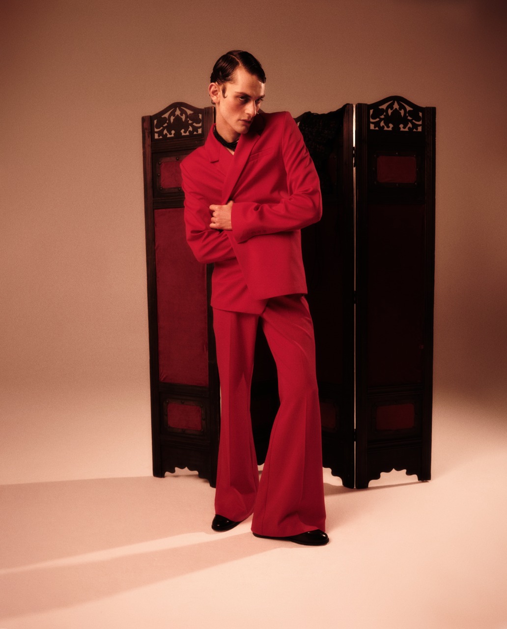 Свободные брюки клеш на резинке с высокой посадкой и объемный пиджак с зауженным силуэтом созданы и pour les hommes, и pour les femmes. К жакету прилагается тонкий пояс-шнурок. Собрать полноценный костюм-тройку можно, добавив в образ прилегающий к телу жилет. Для более игривого настроения есть юбка мини на заниженной посадке.