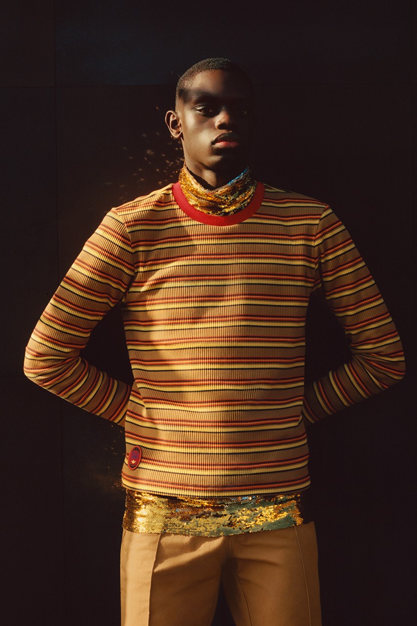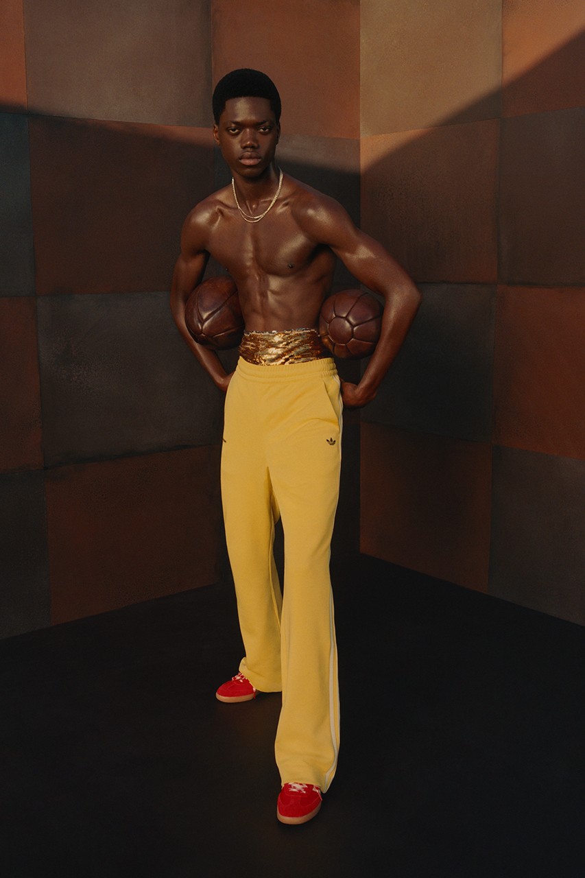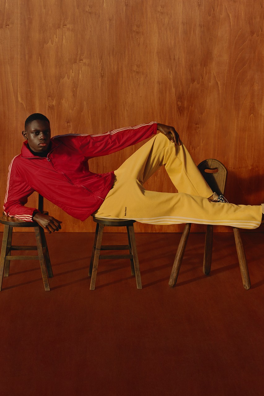 Среди ярких моделей коллаборации — изделия из жаккардового трикотажа, переосмысленные в эстетике 70-х топ и спортивные штаны Wales Bonner. В коллекцию также вошли жилетки, шорты и полосатые водолазки.