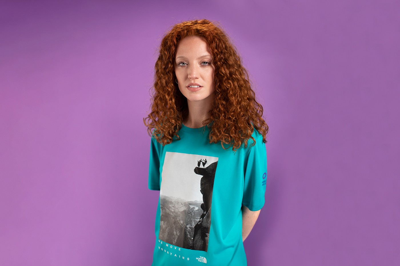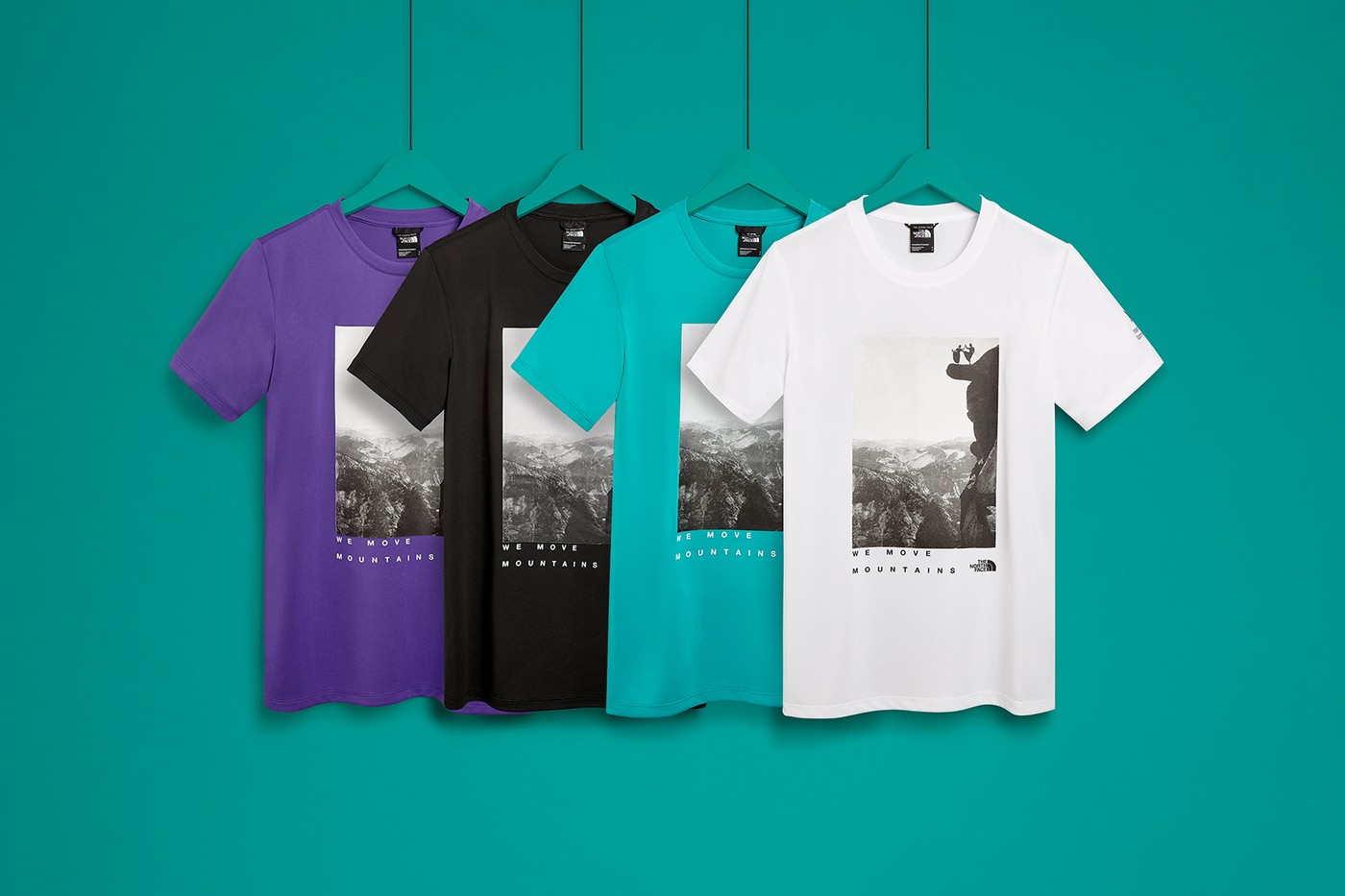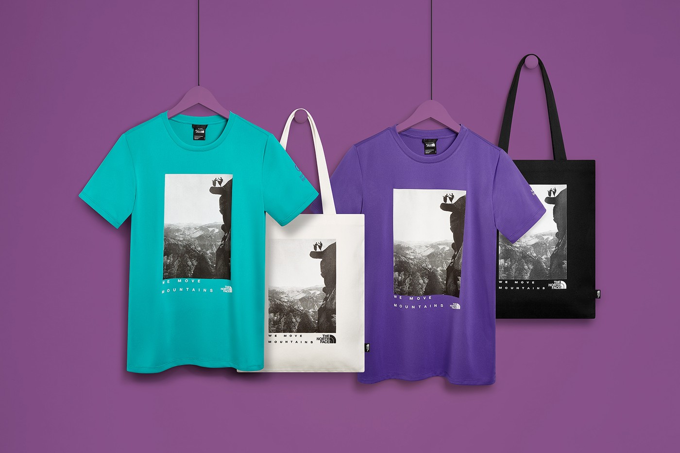 В коллекцию вошли футболки и сумки фиолетового, черного и бирюзового цветов, декорированные логотипом The North Face и черно-белым снимком из архива Йосемитского национального парка в Калифорнии с изображением двух женщин, танцующих на краю обрыва.