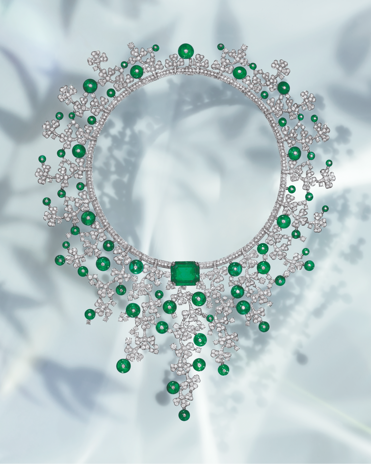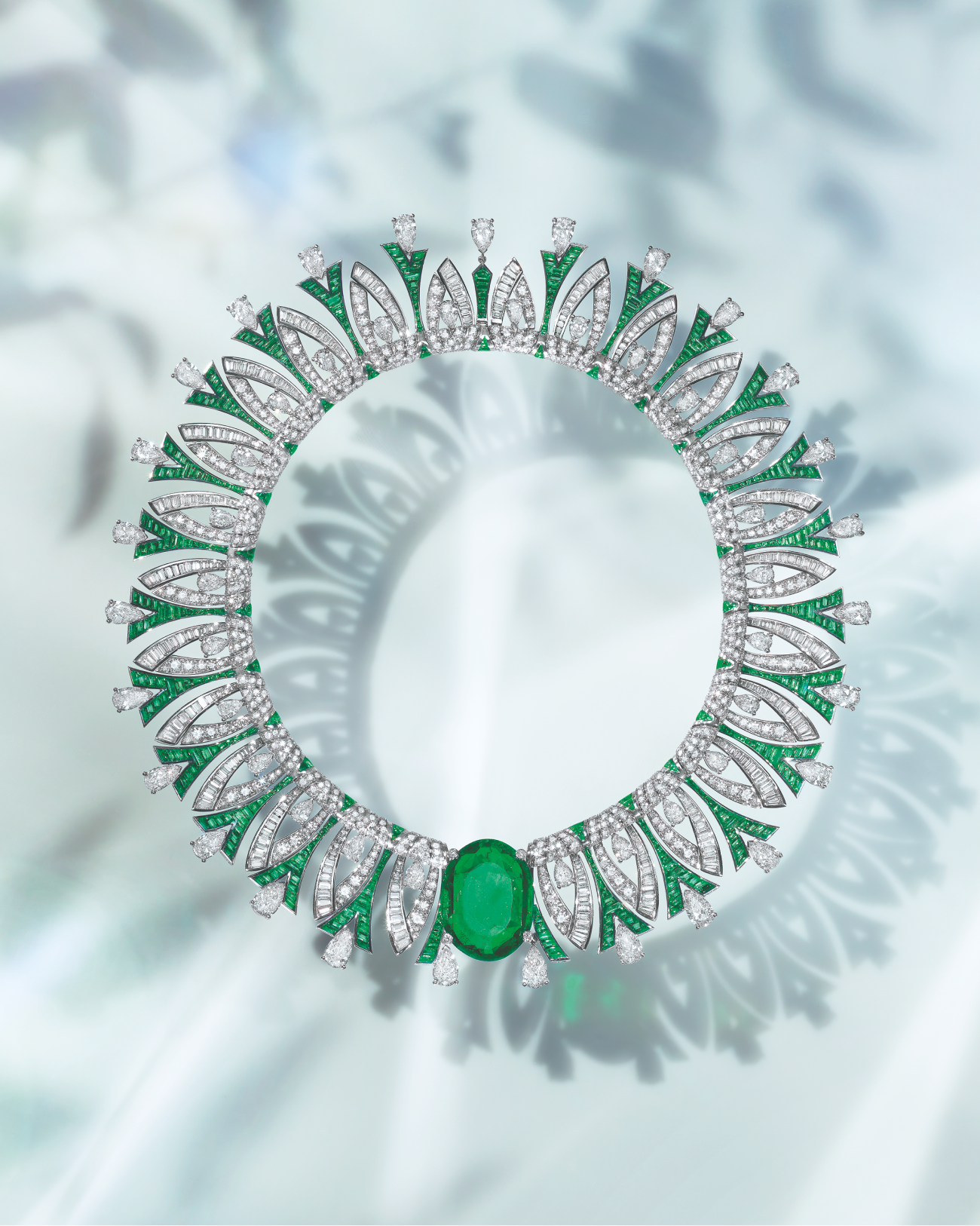 Его красоту мастера Bvlgari увековечили в трехъярусном ожерелье-чокере Emerald Glory. Для создания изделия потребовалось более 3000 часов ручной работы: текстура ожерелья повторяет мягкость узора кружева, а 11 грушевидных колумбийских изумрудов окружены каскадом из бриллиантов общим весом более 220 карат.