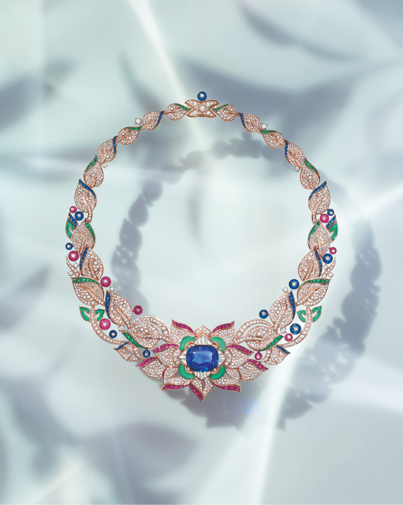 А в колье Flowers of Eden асимметричные, подчеркивающие спонтанность природы турмалины, сердолики, аметисты и изумруды окружают три перламутровых цветка, украшенных бриллиантами. Ожерелье создавалось вручную мастерами Bvlgari с использованием древней техники лепки и модельного воска.